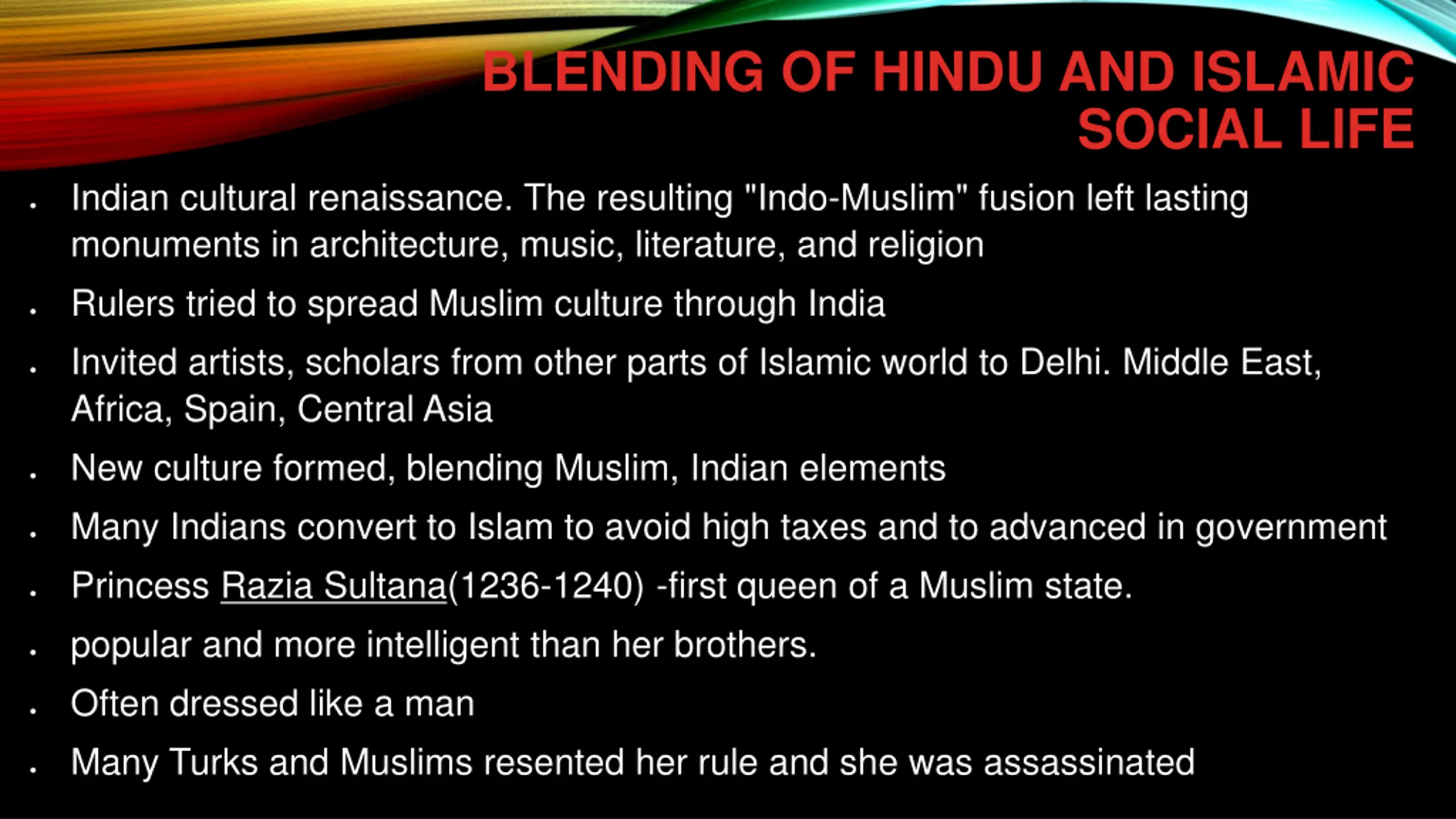 BLENDING OF HINDU AND ISLAMIC SOCIAL LIFE Indian cultural renaissance. The resulting "Indo-Muslim" fusion left lasting monuments in architecture, music, literature, and religion Rulers tried to spread Muslim culture through India Invited artists, scholars from other parts of Islamic world to Delhi. Middle East, Africa, Spain, Central Asia New culture formed, blending Muslim, Indian elements Many Indians convert to Islam to avoid high taxes and to advanced in government Princess Razia Sultana(1236-1240) -first queen of a Muslim state. popular and more intelligent than her brothers. Often dressed like a man Many Turks and Muslims resented her rule and she was assassinated