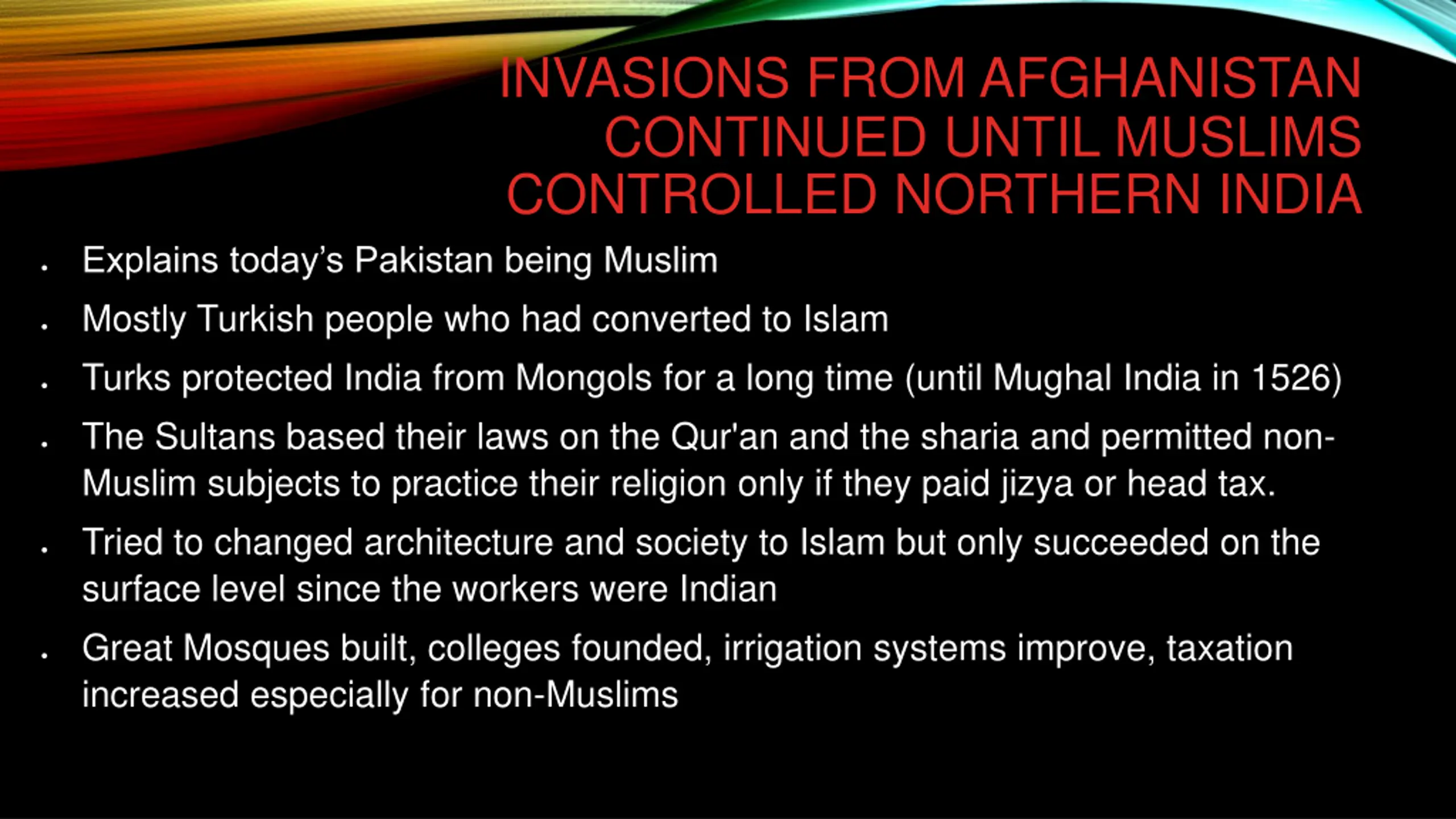 INVASIONS FROM AFGHANISTAN CONTINUED UNTIL MUSLIMS CONTROLLED NORTHERN INDIA Explains today s Pakistan being Muslim Mostly Turkish people who had converted to Islam Turks protected India from Mongols for a long time (until Mughal India in 1526) The Sultans based their laws on the Qur'an and the sharia and permitted non- Muslim subjects to practice their religion only if they paid jizya or head tax. Tried to changed architecture and society to Islam but only succeeded on the surface level since the workers were Indian Great Mosques built, colleges founded, irrigation systems improve, taxation increased especially for non-Muslims