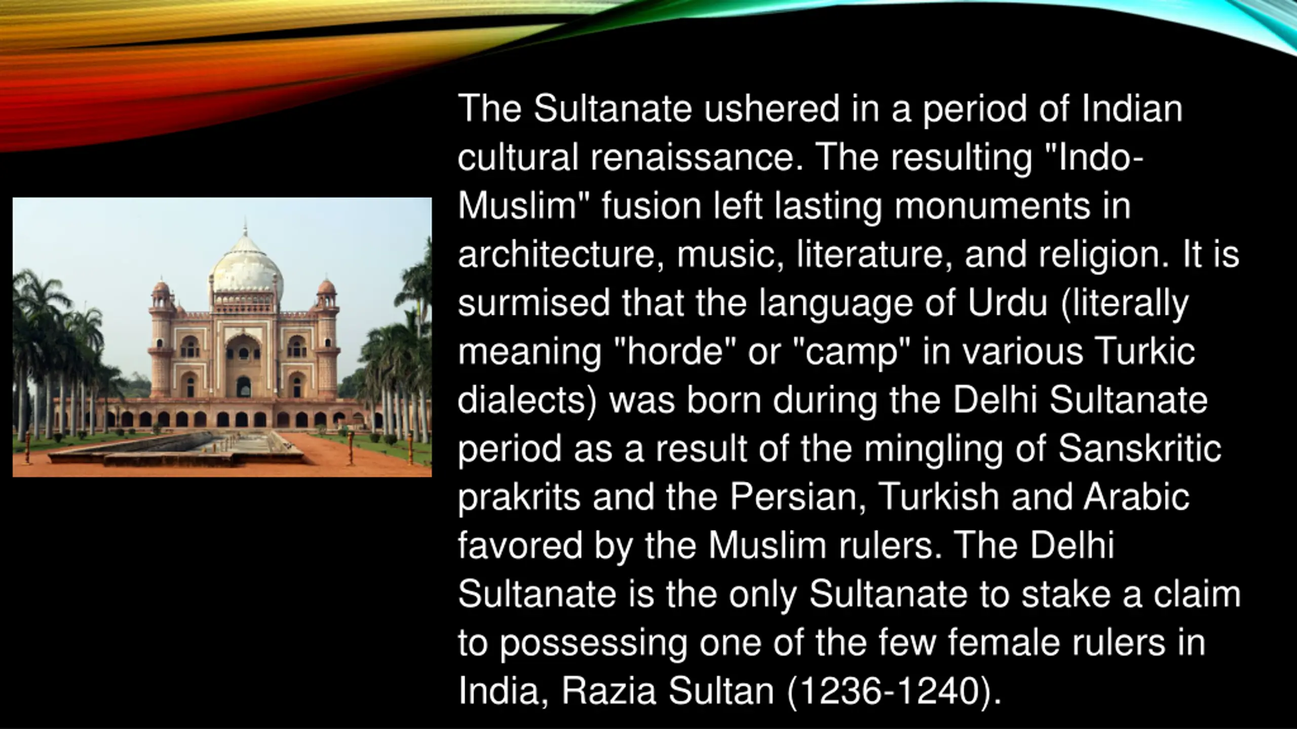 The Sultanate ushered in a period of Indian cultural renaissance. The resulting "Indo- Muslim" fusion left lasting monuments in architecture, music, literature, and religion. It is surmised that the language of Urdu (literally meaning "horde" or "camp" in various Turkic dialects) was born during the Delhi Sultanate period as a result of the mingling of Sanskritic prakrits and the Persian, Turkish and Arabic favored by the Muslim rulers. The Delhi Sultanate is the only Sultanate to stake a claim to possessing one of the few female rulers in India, Razia Sultan (1236-1240).