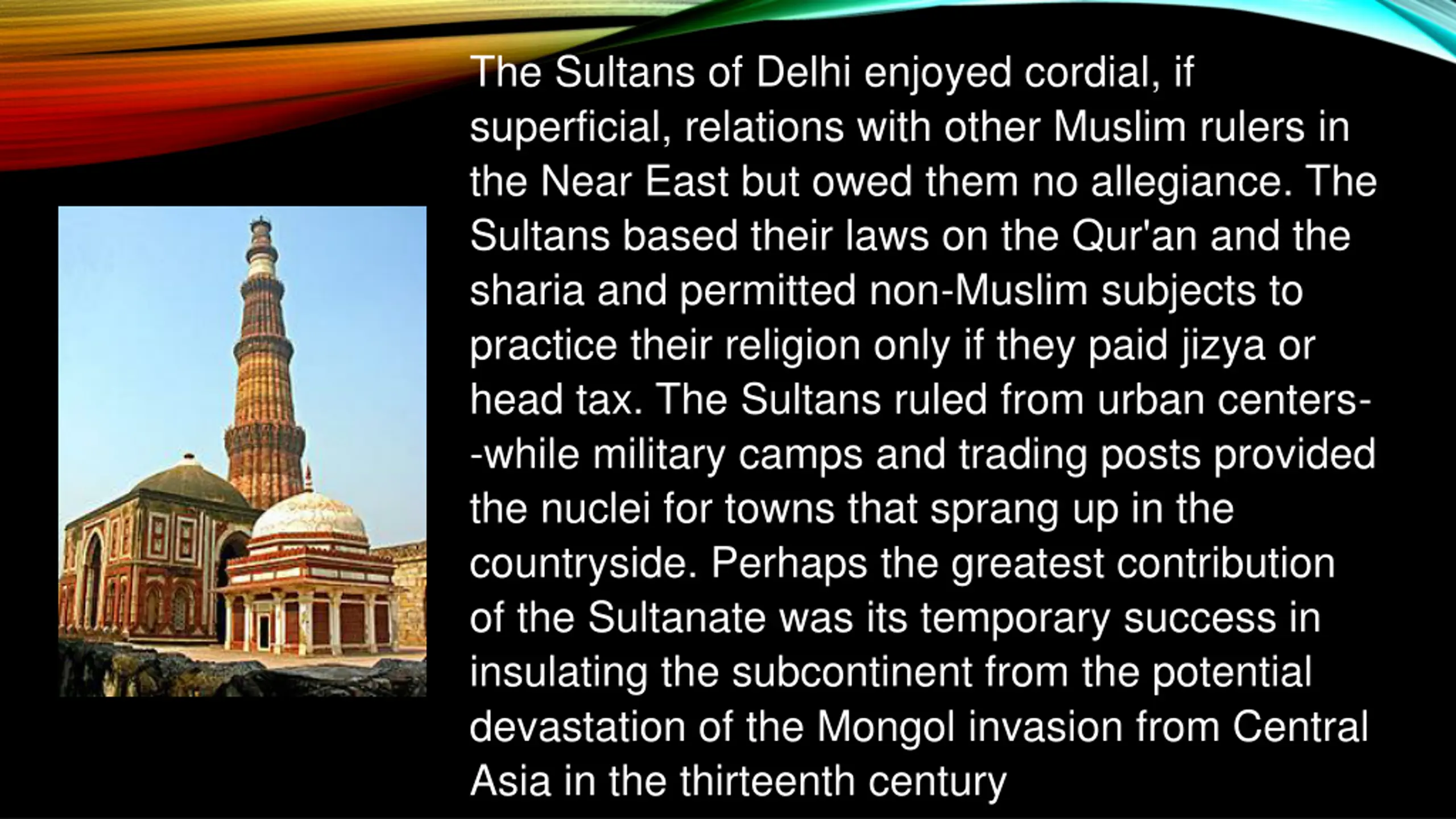 The Sultans of Delhi enjoyed cordial, if superficial, relations with other Muslim rulers in the Near East but owed them no allegiance. The Sultans based their laws on the Qur'an and the sharia and permitted non-Muslim subjects to practice their religion only if they paid jizya or head tax. The Sultans ruled from urban centers- -while military camps and trading posts provided the nuclei for towns that sprang up in the countryside. Perhaps the greatest contribution of the Sultanate was its temporary success in insulating the subcontinent from the potential devastation of the Mongol invasion from Central Asia in the thirteenth century