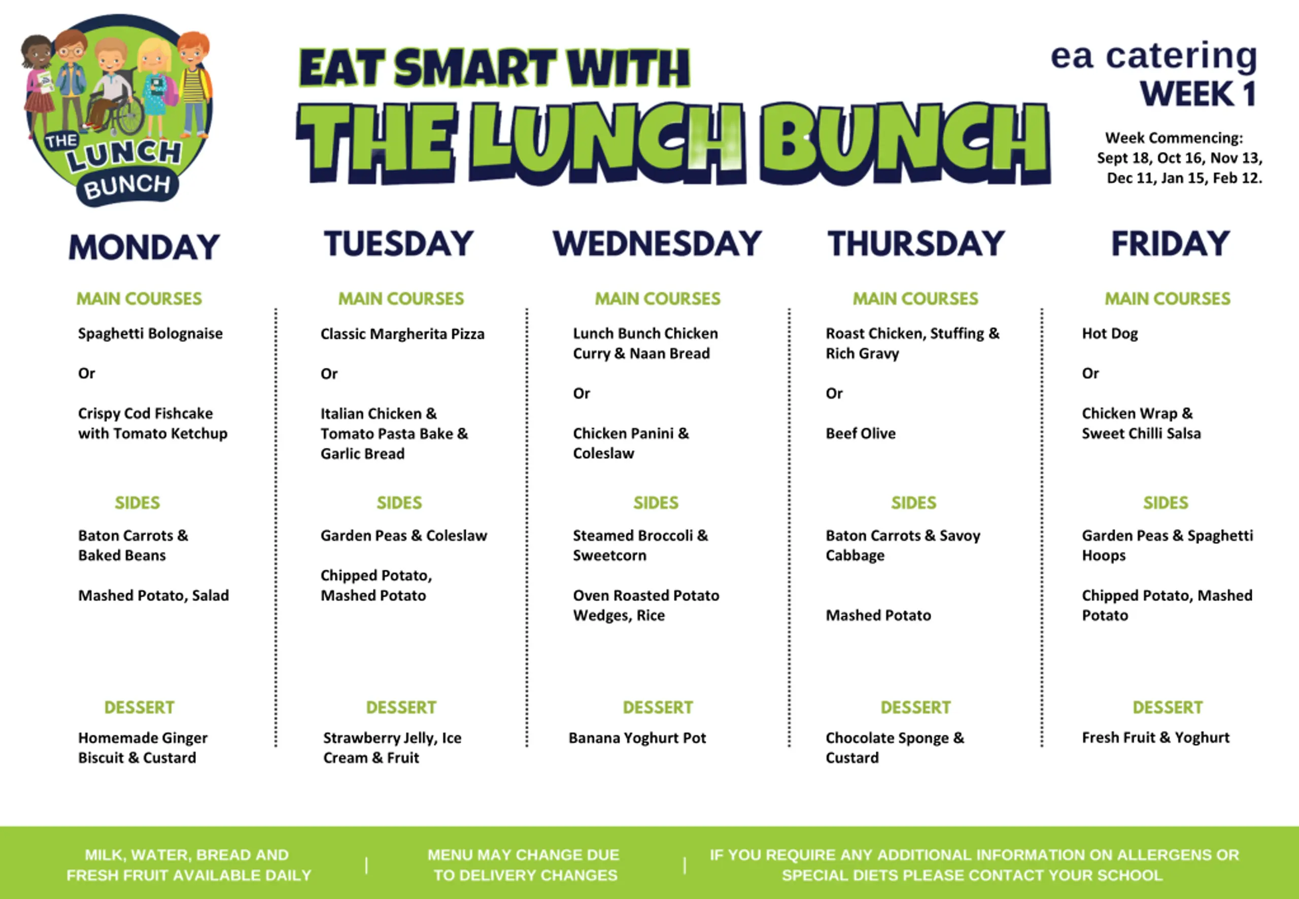 Week Commencing: Sept 18, Oct 16, Nov 13, Dec 11, Jan 15, Feb 12. Spaghetti Bolognaise Lunch Bunch Chicken Curry & Naan Bread Roast Chicken, Stuffing & Rich Gravy Hot Dog Classic Margherita Pizza Or Or Or Or Or Crispy Cod Fishcake with Tomato Ketchup Chicken Wrap & Sweet Chilli Salsa Italian Chicken & Tomato Pasta Bake & Garlic Bread Chicken Panini & Coleslaw Beef Olive Baton Carrots & Baked Beans Garden Peas & Coleslaw Steamed Broccoli & Sweetcorn Baton Carrots & Savoy Cabbage Garden Peas & Spaghetti Hoops Chipped Potato, Mashed Potato Mashed Potato, Salad Oven Roasted Potato Wedges, Rice Chipped Potato, Mashed Potato Mashed Potato Fresh Fruit & Yoghurt Homemade Ginger Biscuit & Custard Strawberry Jelly, Ice Cream & Fruit Banana Yoghurt Pot Chocolate Sponge & Custard