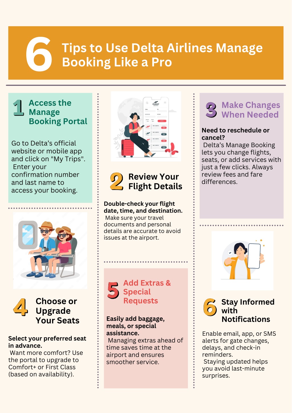 6 Tips to Use Delta Airlines Manage Booking Like a Pro Access the Manage Booking Portal Make Changes When Needed Need to reschedule or cancel? Delta s Manage Booking lets you change flights, seats, or add services with just a few clicks. Always review fees and fare differences. Go to Delta s official website or mobile app and click on "My Trips". Enter your confirmation number and last name to access your booking. Review Your Flight Details Double-check your flight date, time, and destination. Make sure your travel documents and personal details are accurate to avoid issues at the airport. Add Extras & Special Requests Choose or Upgrade Your Seats Stay Informed with Notifications Easily add baggage, meals, or special assistance. Managing extras ahead of time saves time at the airport and ensures smoother service. Enable email, app, or SMS alerts for gate changes, delays, and check-in reminders. Staying updated helps you avoid last-minute surprises. Select your preferred seat in advance. Want more comfort? Use the portal to upgrade to Comfort+ or First Class (based on availability).