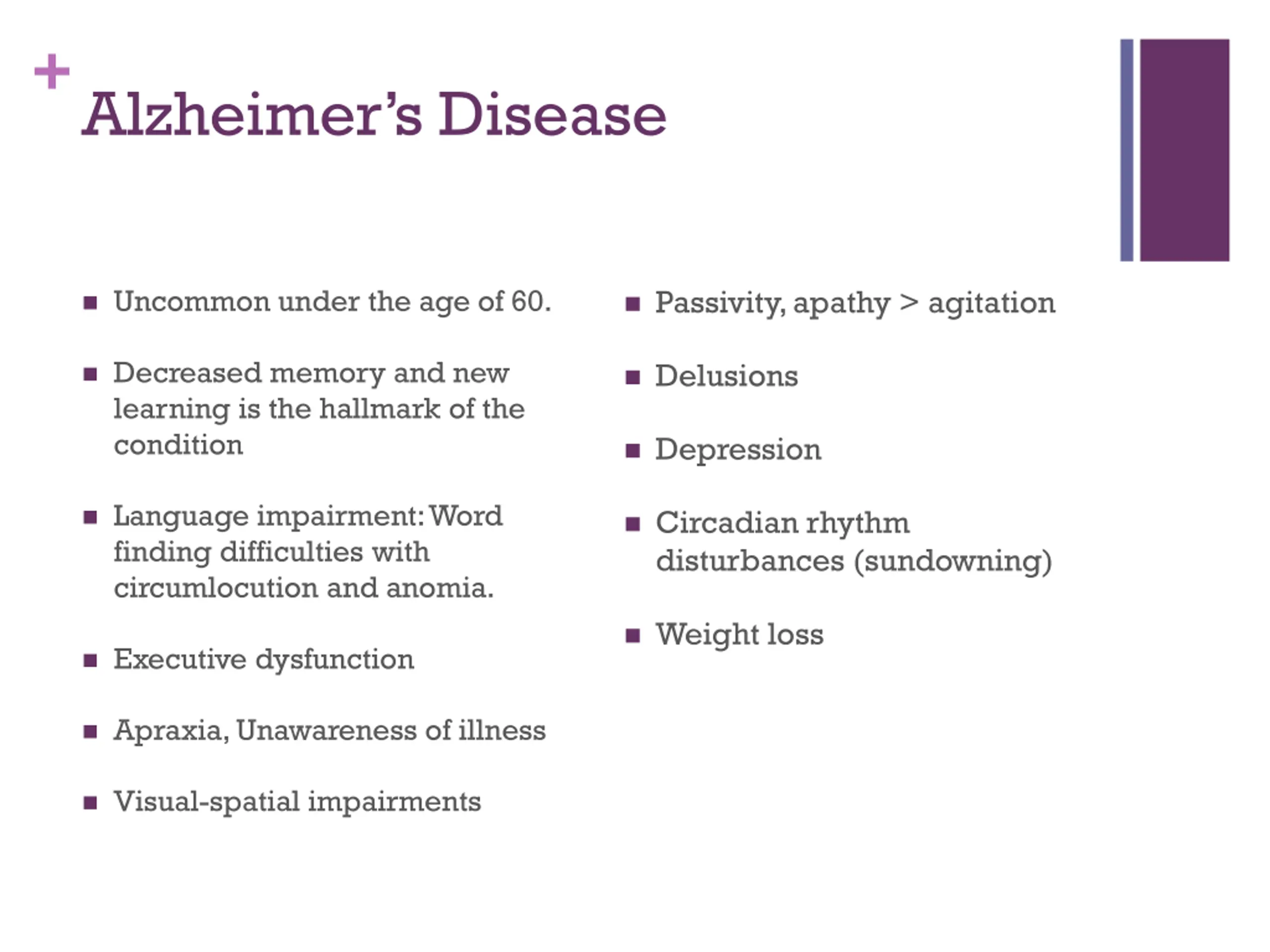 +Alzheimers Disease Uncommon under the age of 60. Passivity, apathy > agitation Decreased memory and new learning is the hallmark of the condition Delusions Depression Language impairment: Word finding difficulties with circumlocution and anomia. Circadian rhythm disturbances (sundowning) Weight loss Executive dysfunction Apraxia, Unawareness of illness Visual-spatial impairments