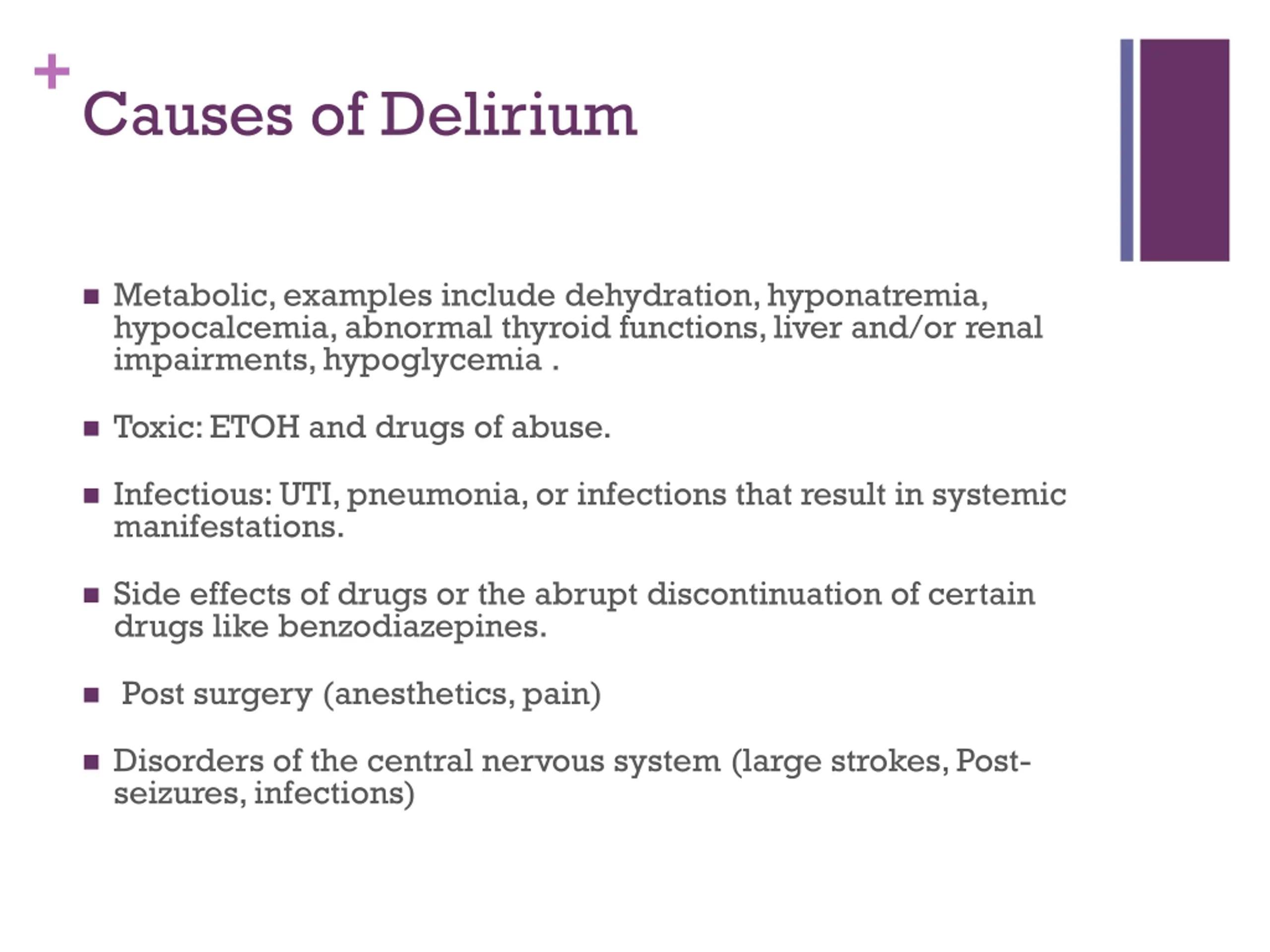 +Causes of Delirium Metabolic, examples include dehydration, hyponatremia, hypocalcemia, abnormal thyroid functions, liver and/or renal impairments, hypoglycemia . Toxic: ETOH and drugs of abuse. Infectious: UTI, pneumonia, or infections that result in systemic manifestations. Side effects of drugs or the abrupt discontinuation of certain drugs like benzodiazepines. Post surgery (anesthetics, pain) Disorders of the central nervous system (large strokes, Post- seizures, infections)