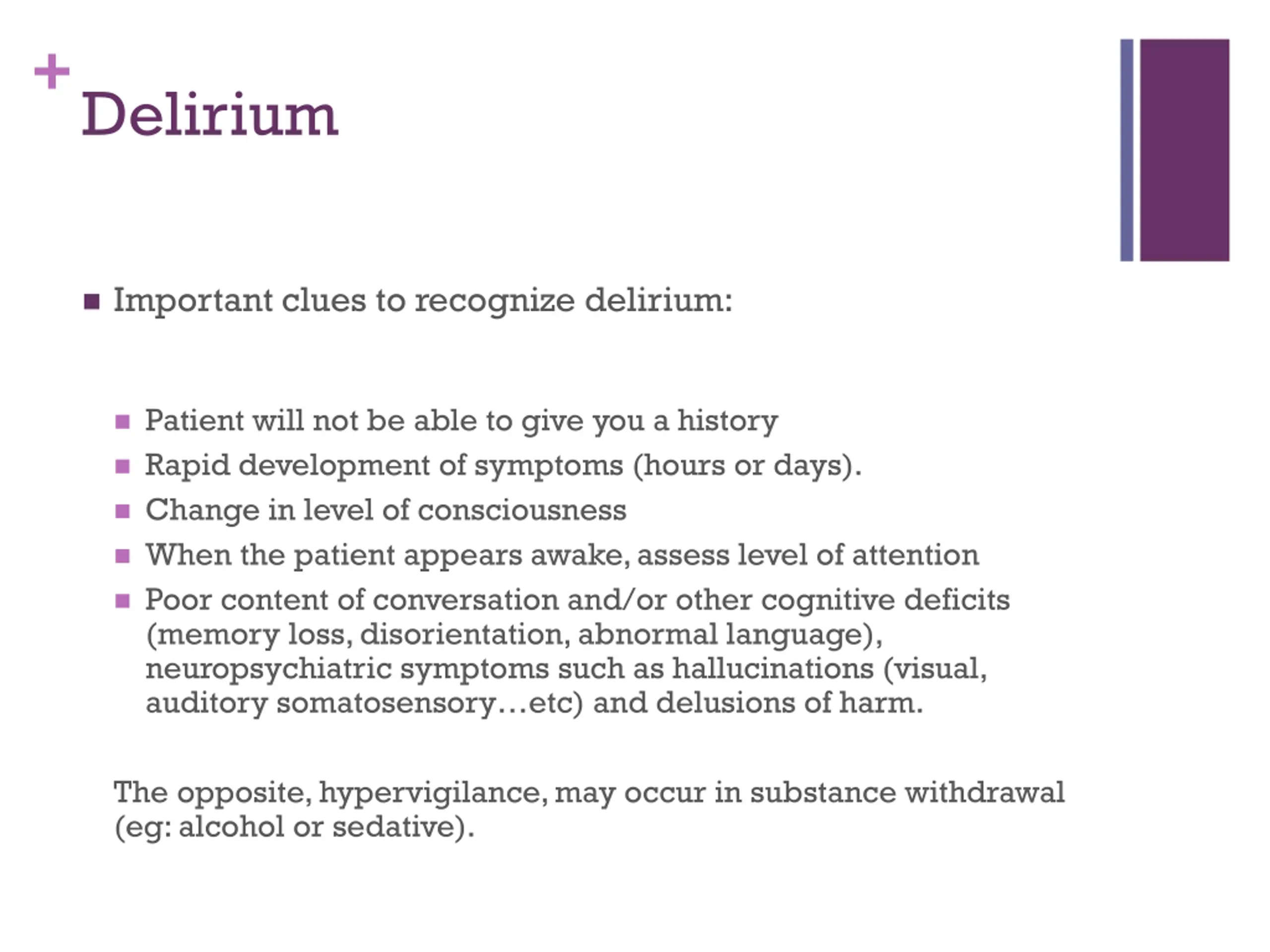 +Delirium Important clues to recognize delirium: Patient will not be able to give you a history Rapid development of symptoms (hours or days). Change in level of consciousness When the patient appears awake, assess level of attention Poor content of conversation and/or other cognitive deficits (memory loss, disorientation, abnormal language), neuropsychiatric symptoms such as hallucinations (visual, auditory somatosensory etc) and delusions of harm. The opposite, hypervigilance, may occur in substance withdrawal (eg: alcohol or sedative).