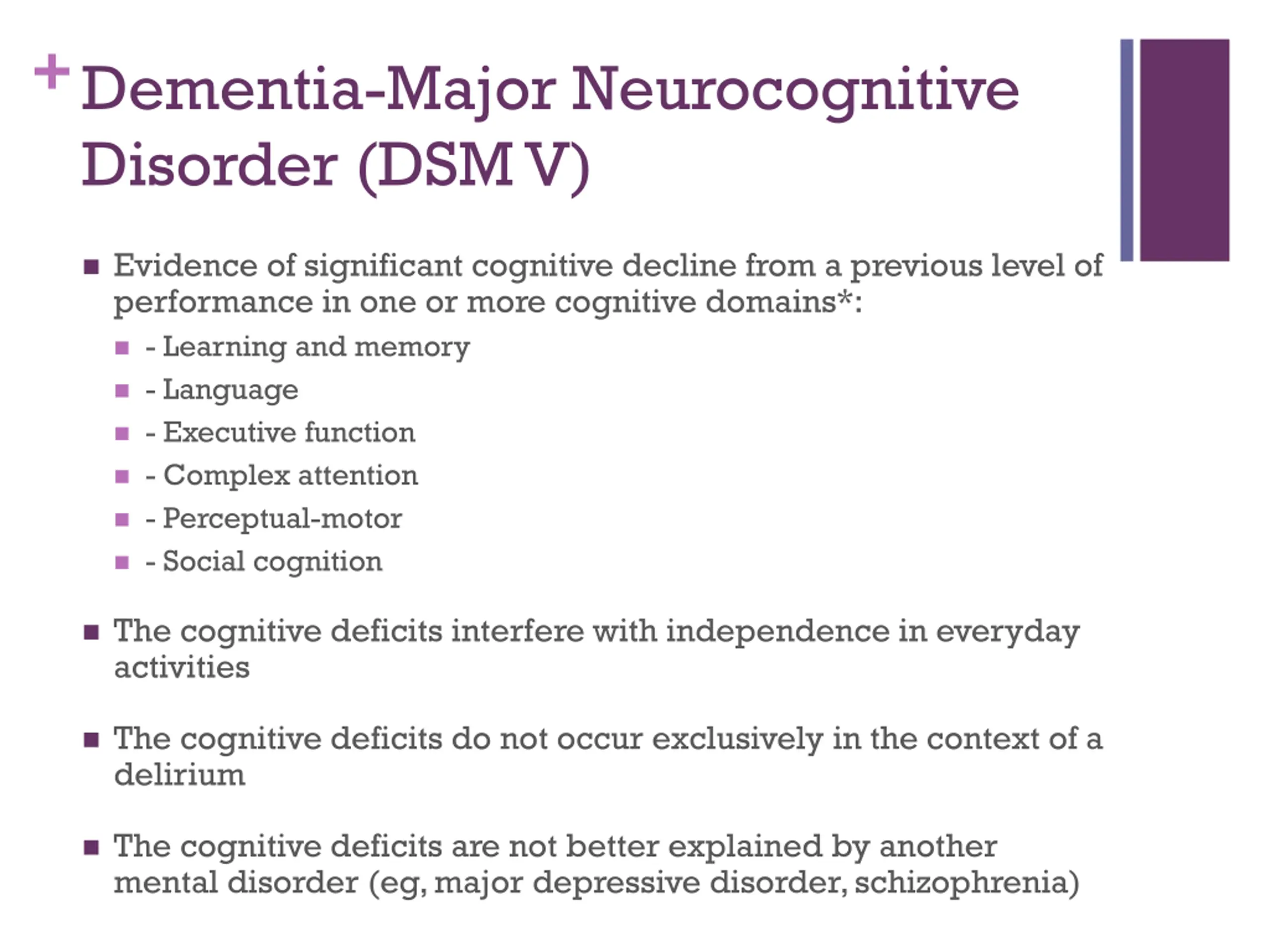 +Dementia-Major Neurocognitive Disorder (DSM V) Evidence of significant cognitive decline from a previous level of performance in one or more cognitive domains*: - Learning and memory - Language - Executive function - Complex attention - Perceptual-motor - Social cognition The cognitive deficits interfere with independence in everyday activities The cognitive deficits do not occur exclusively in the context of a delirium The cognitive deficits are not better explained by another mental disorder (eg, major depressive disorder, schizophrenia)