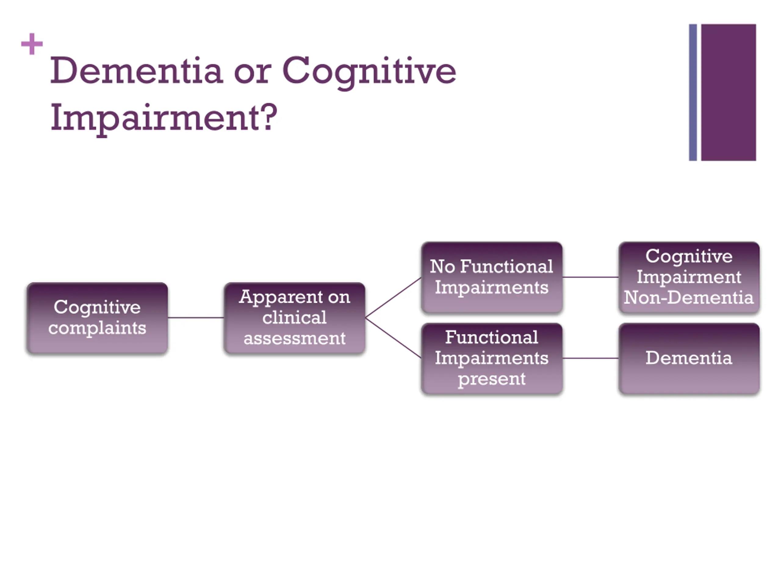 +Dementia or Cognitive Impairment? Cognitive Impairment Non-Dementia No Functional Impairments Apparent on clinical assessment Cognitive complaints Functional Impairments present Dementia