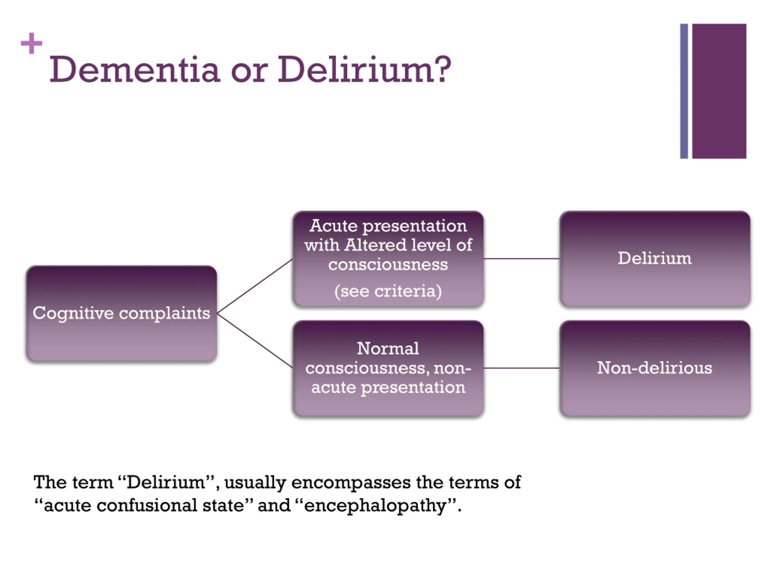 +Dementia or Delirium? Acute presentation with Altered level of consciousness (see criteria) Delirium Cognitive complaints Normal Non-delirious consciousness, non- acute presentation The term Delirium , usually encompasses the terms of acute confusional state and encephalopathy .