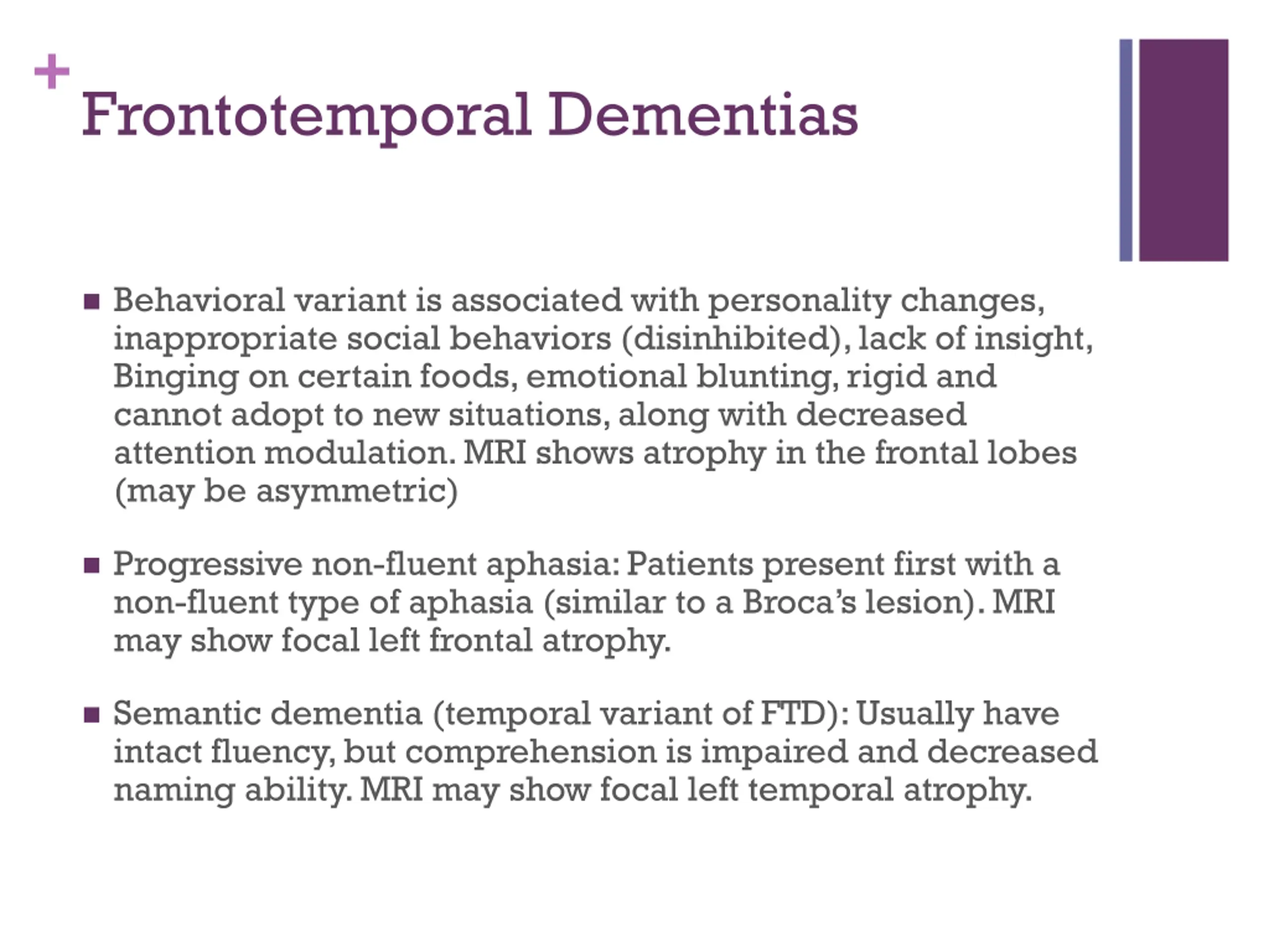 +Frontotemporal Dementias Behavioral variant is associated with personality changes, inappropriate social behaviors (disinhibited), lack of insight, Binging on certain foods, emotional blunting, rigid and cannot adopt to new situations, along with decreased attention modulation. MRI shows atrophy in the frontal lobes (may be asymmetric) Progressive non-fluent aphasia: Patients present first with a non-fluent type of aphasia (similar to a Broca s lesion). MRI may show focal left frontal atrophy. Semantic dementia (temporal variant of FTD): Usually have intact fluency, but comprehension is impaired and decreased naming ability. MRI may show focal left temporal atrophy.