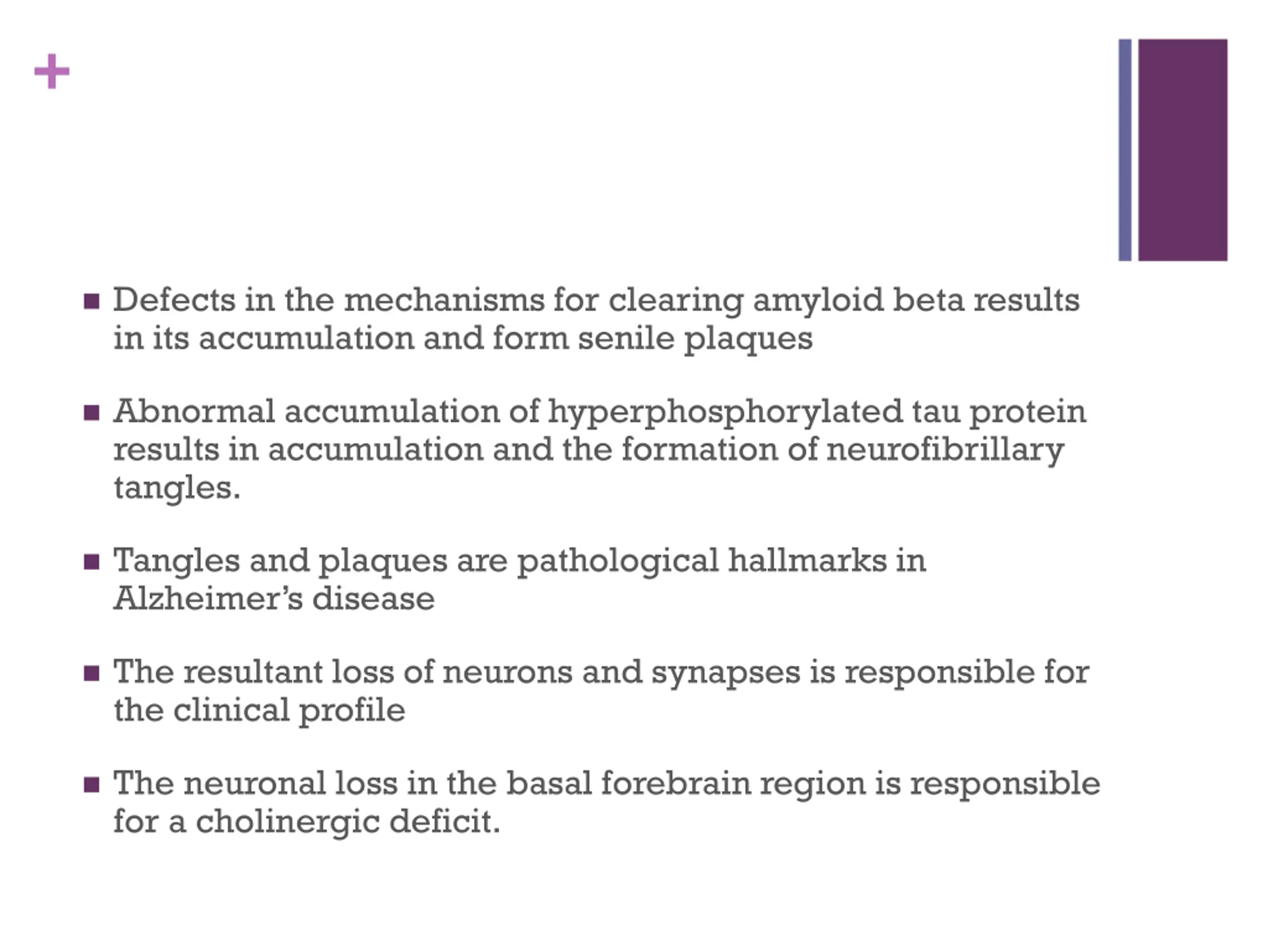 + Defects in the mechanisms for clearing amyloid beta results in its accumulation and form senile plaques Abnormal accumulation of hyperphosphorylated tau protein results in accumulation and the formation of neurofibrillary tangles. Tangles and plaques are pathological hallmarks in Alzheimer s disease The resultant loss of neurons and synapses is responsible for the clinical profile The neuronal loss in the basal forebrain region is responsible for a cholinergic deficit.