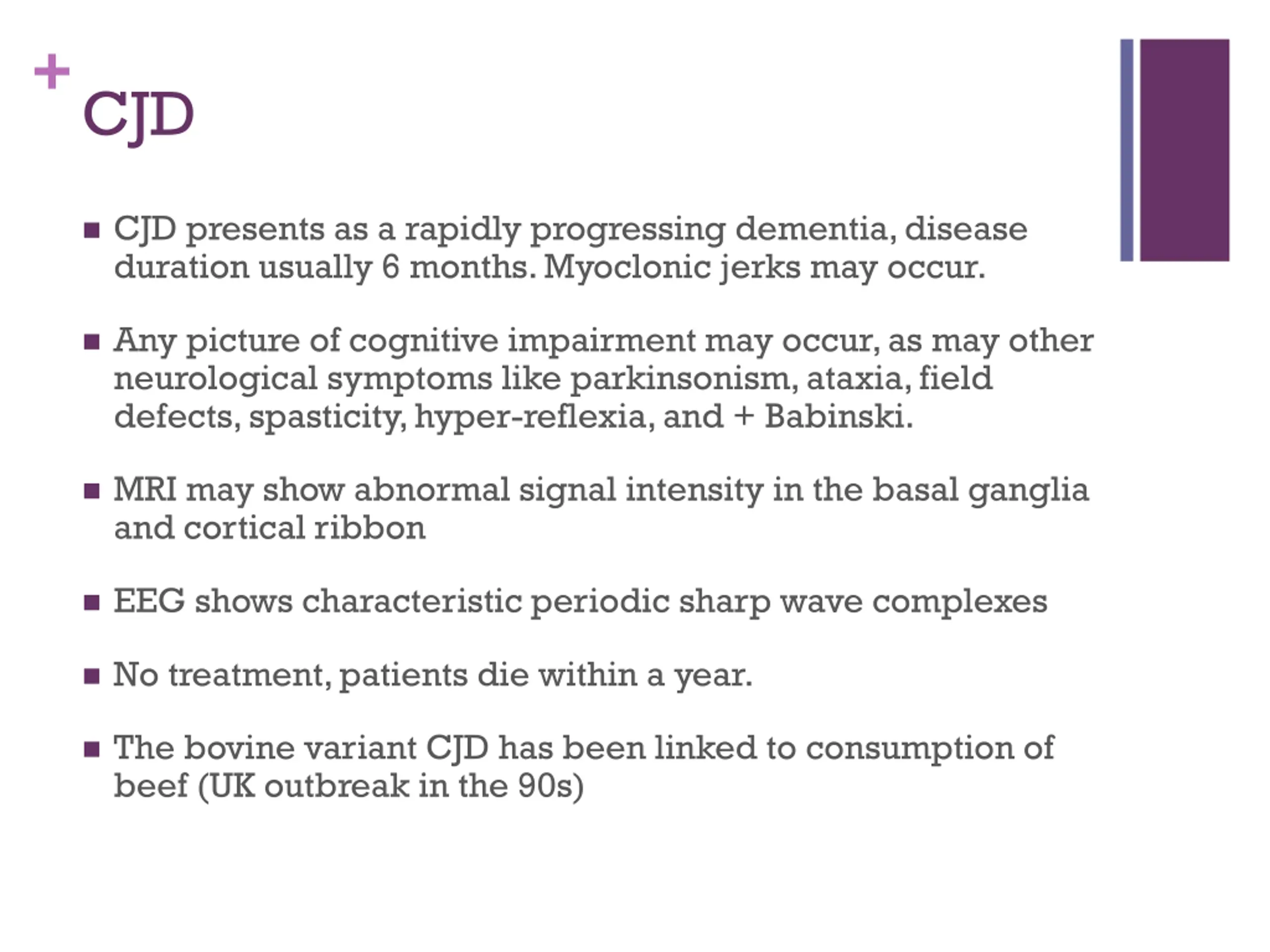 +CJD CJD presents as a rapidly progressing dementia, disease duration usually 6 months. Myoclonic jerks may occur. Any picture of cognitive impairment may occur, as may other neurological symptoms like parkinsonism, ataxia, field defects, spasticity, hyper-reflexia, and + Babinski. MRI may show abnormal signal intensity in the basal ganglia and cortical ribbon EEG shows characteristic periodic sharp wave complexes No treatment, patients die within a year. The bovine variant CJD has been linked to consumption of beef (UK outbreak in the 90s)
