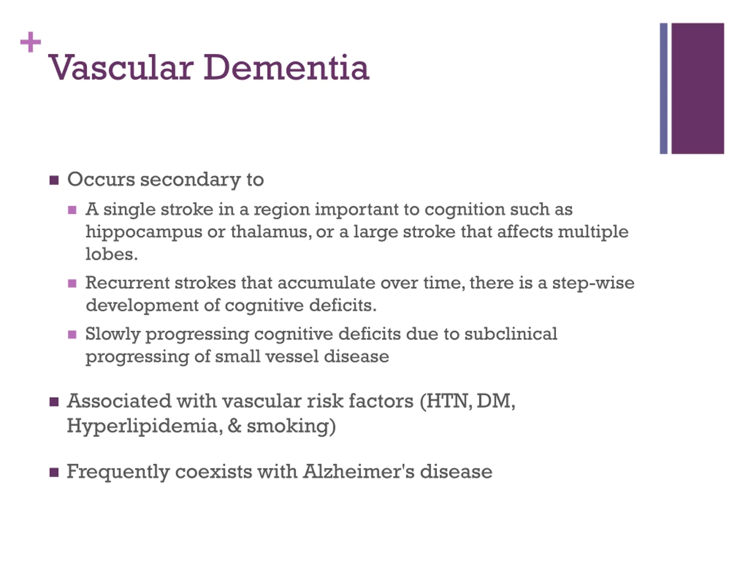 +Vascular Dementia Occurs secondary to A single stroke in a region important to cognition such as hippocampus or thalamus, or a large stroke that affects multiple lobes. Recurrent strokes that accumulate over time, there is a step-wise development of cognitive deficits. Slowly progressing cognitive deficits due to subclinical progressing of small vessel disease Associated with vascular risk factors (HTN, DM, Hyperlipidemia, & smoking) Frequently coexists with Alzheimer's disease