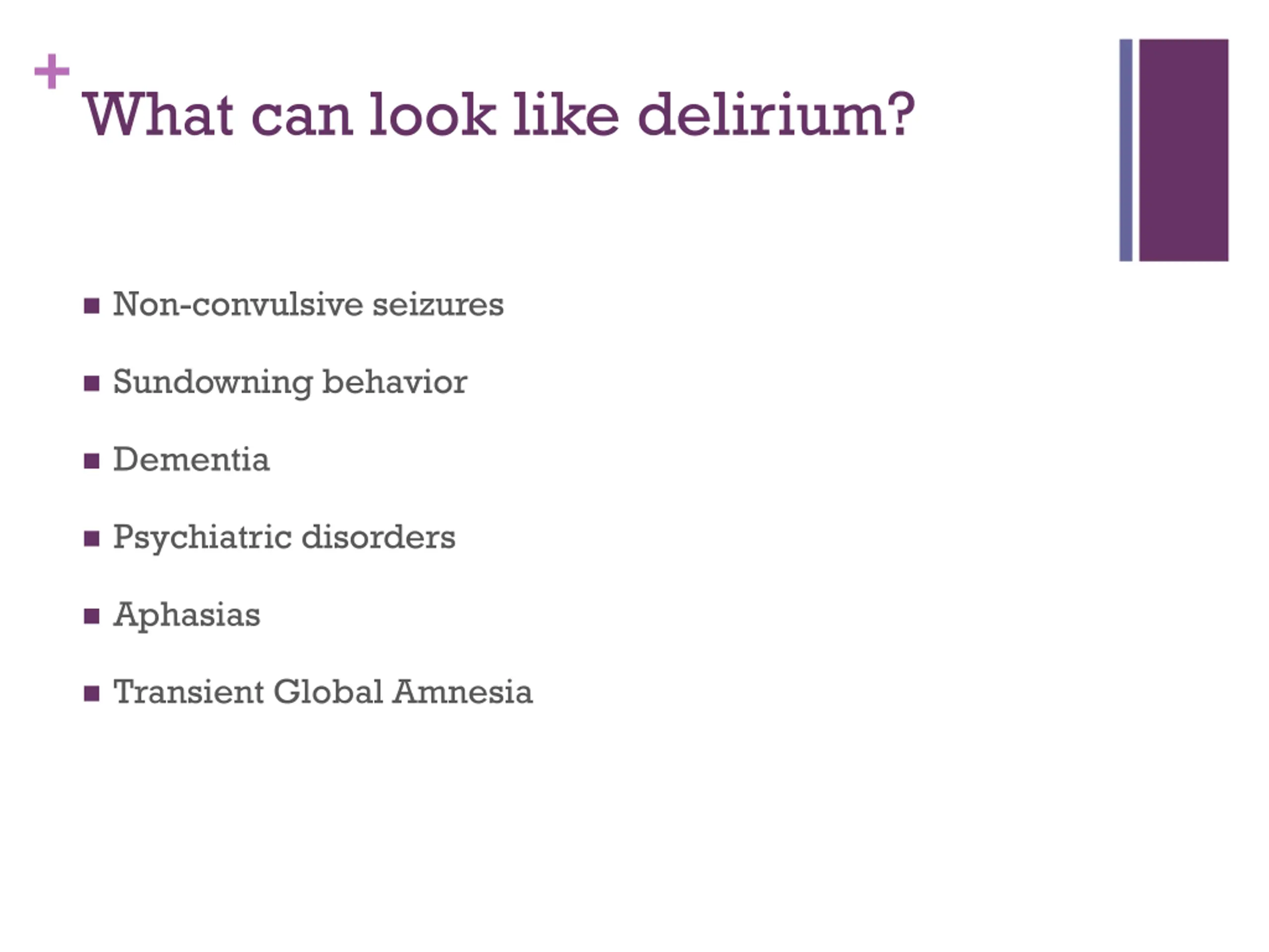 +What can look like delirium? Non-convulsive seizures Sundowning behavior Dementia Psychiatric disorders Aphasias Transient Global Amnesia