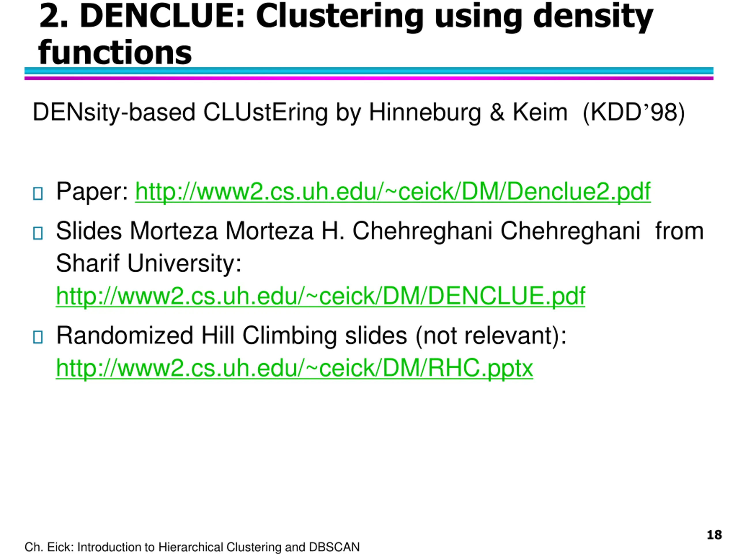2. DENCLUE: Clustering using density functions DENsity-based CLUstEring by Hinneburg & Keim (KDD 98) Paper: http://www2.cs.uh.edu/~ceick/DM/Denclue2.pdf Slides Morteza Morteza H. Chehreghani Chehreghani from Sharif University: http://www2.cs.uh.edu/~ceick/DM/DENCLUE.pdf Randomized Hill Climbing slides (not relevant): http://www2.cs.uh.edu/~ceick/DM/RHC.pptx 18 Ch. Eick: Introduction to Hierarchical Clustering and DBSCAN