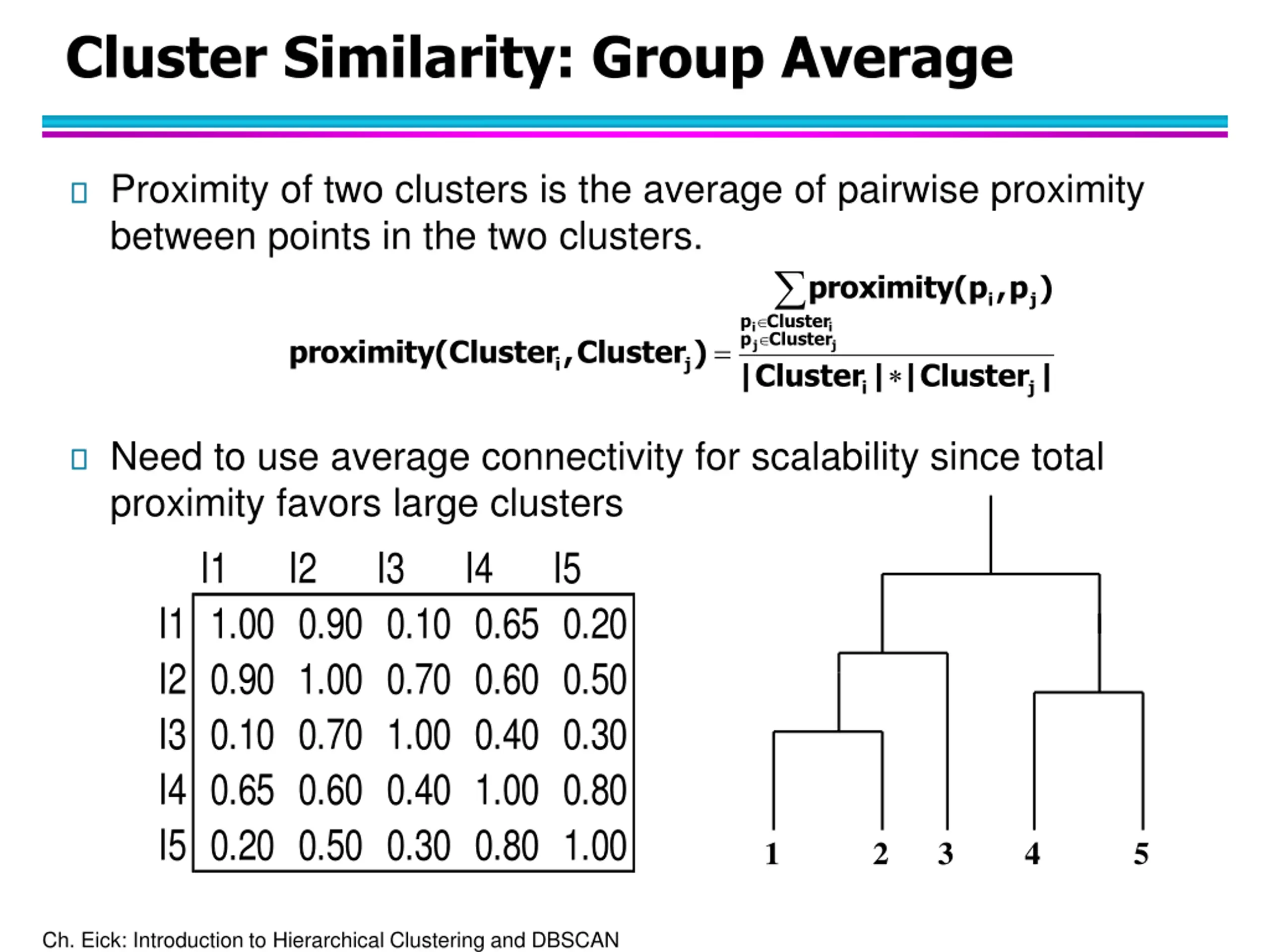 Cluster Similarity: Group Average Proximity of two clusters is the average of pairwise proximity between points in the two clusters. proximity( Cluster j p , p ) i j p i i p Cluster = proximity( Cluster , Cluster ) j i j |Cluster |Cluster | | i j Need to use average connectivity for scalability since total proximity favors large clusters I1 I2 I3 I4 I5 I1 1.00 0.90 0.10 0.65 0.20 I2 0.90 1.00 0.70 0.60 0.50 I3 0.10 0.70 1.00 0.40 0.30 I4 0.65 0.60 0.40 1.00 0.80 I5 0.20 0.50 0.30 0.80 1.00 1 2 3 4 5 Ch. Eick: Introduction to Hierarchical Clustering and DBSCAN