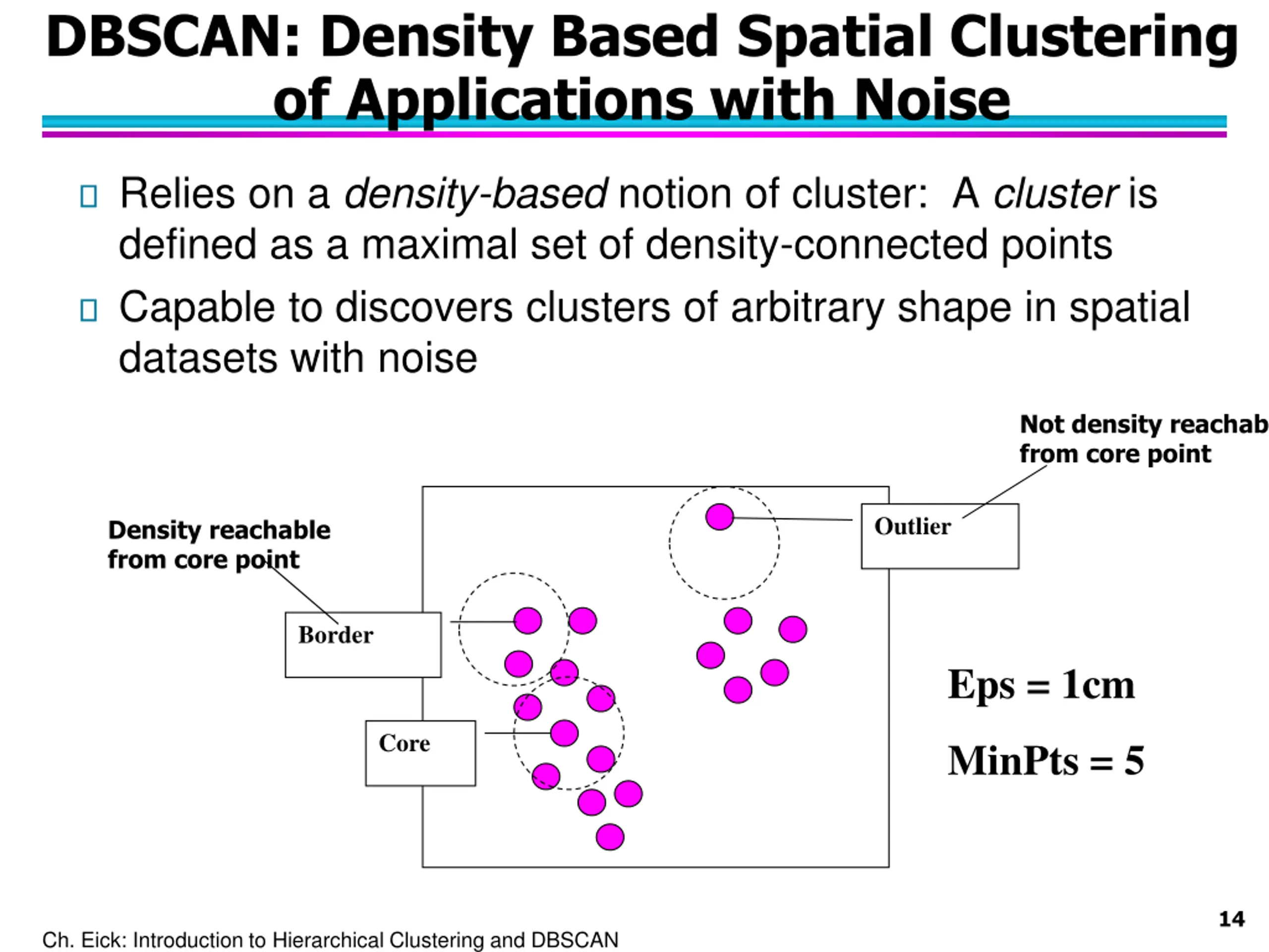 DBSCAN (http://www2.cs.uh.edu/~ceick/7363/Papers/dbscan.pdf ) DBSCAN is a density-based algorithm. Density = number of points within a specified radius (Eps) Input parameter: MinPts and Eps A point is a core point if it has more than a specified number of points (MinPts) within Eps These are points that are at the interior of a cluster A border point has fewer than MinPts within Eps, but is in the neighborhood of a core point A noise point is any point that is not a core point or a border point. Ch. Eick: Introduction to Hierarchical Clustering and DBSCAN