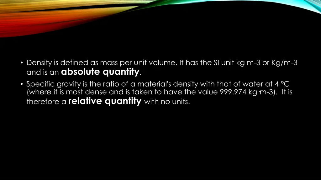 Density is defined as mass per unit volume. It has the SI unit kg m-3 or Kg/m-3 and is an absolute quantity. Specific gravity is the ratio of a material's density with that of water at 4 C (where it is most dense and is taken to have the value 999.974 kg m-3). It is therefore a relative quantity with no units.