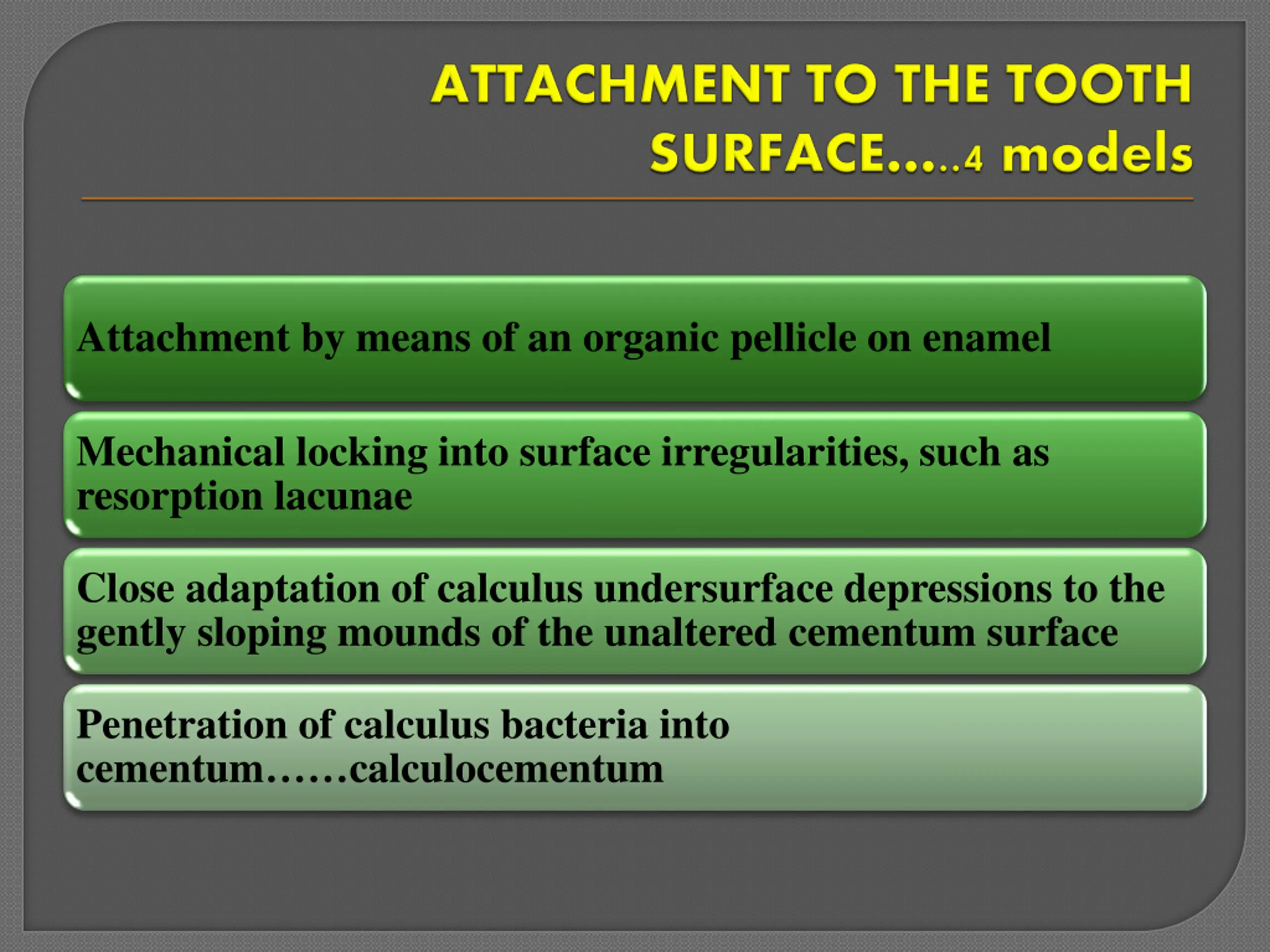 Attachment by means of an organic pellicle on enamel Mechanical locking into surface irregularities, such as resorption lacunae Close adaptation of calculus undersurface depressions to the gently sloping mounds of the unaltered cementum surface Penetration of calculus bacteria into cementum calculocementum
