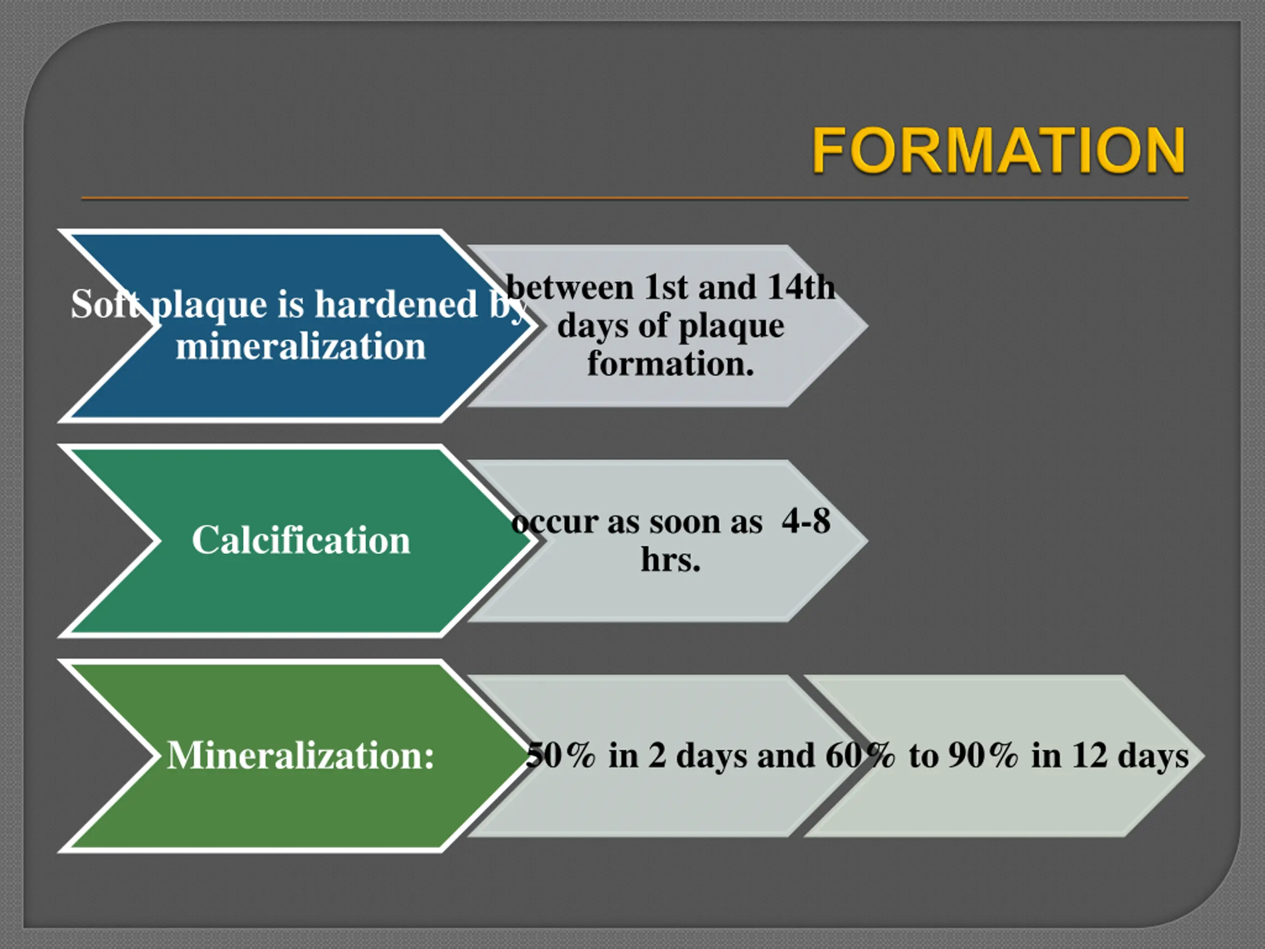 between 1st and 14th days of plaque formation. Soft plaque is hardened by mineralization occur as soon as 4-8 hrs. Calcification Mineralization: 50% in 2 days and 60% to 90% in 12 days