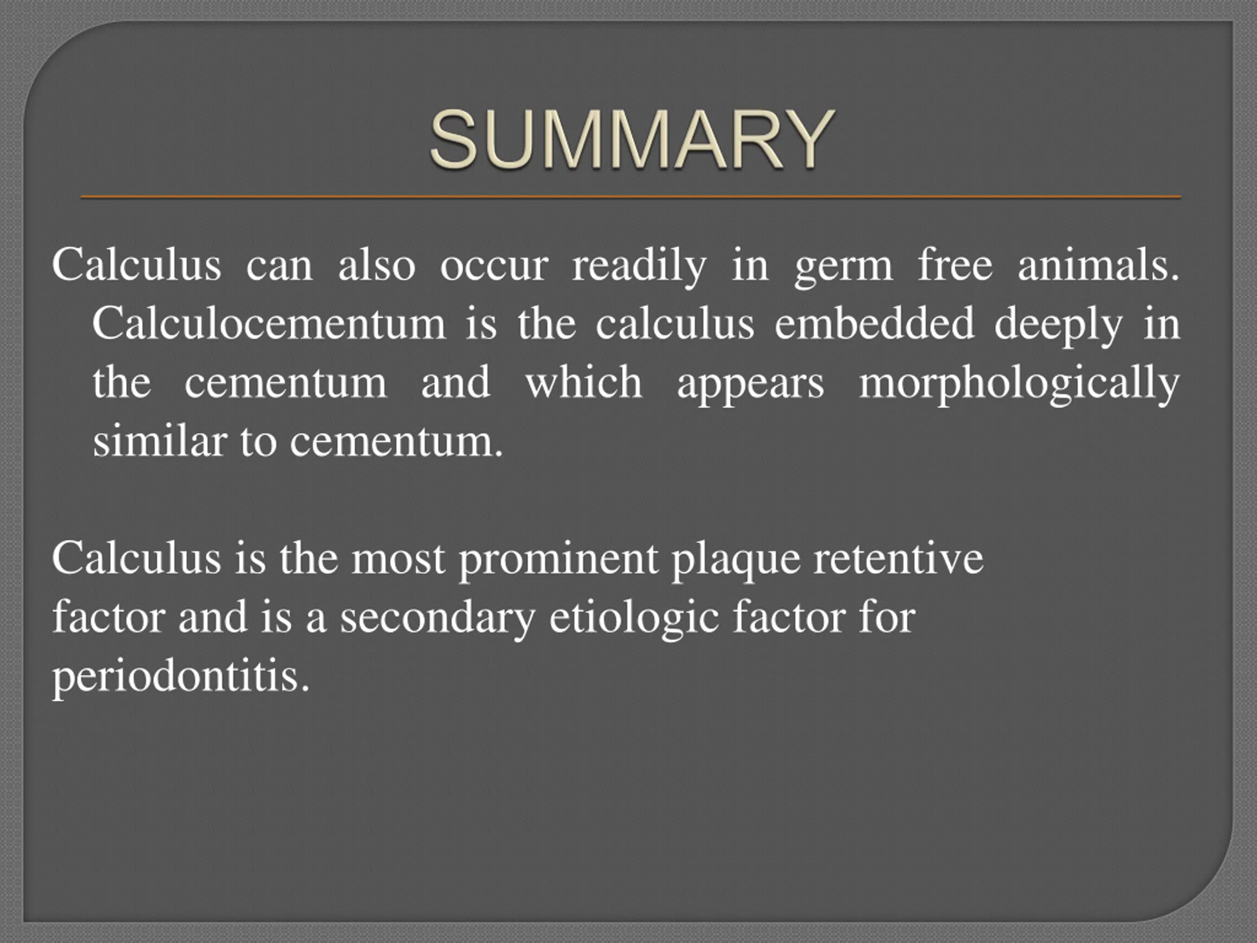 Calculus can also occur readily in germ free animals. Calculocementum is the calculus embedded deeply in the cementum and which appears morphologically similar to cementum. Calculus is the most prominent plaque retentive factor and is a secondary etiologic factor for periodontitis.