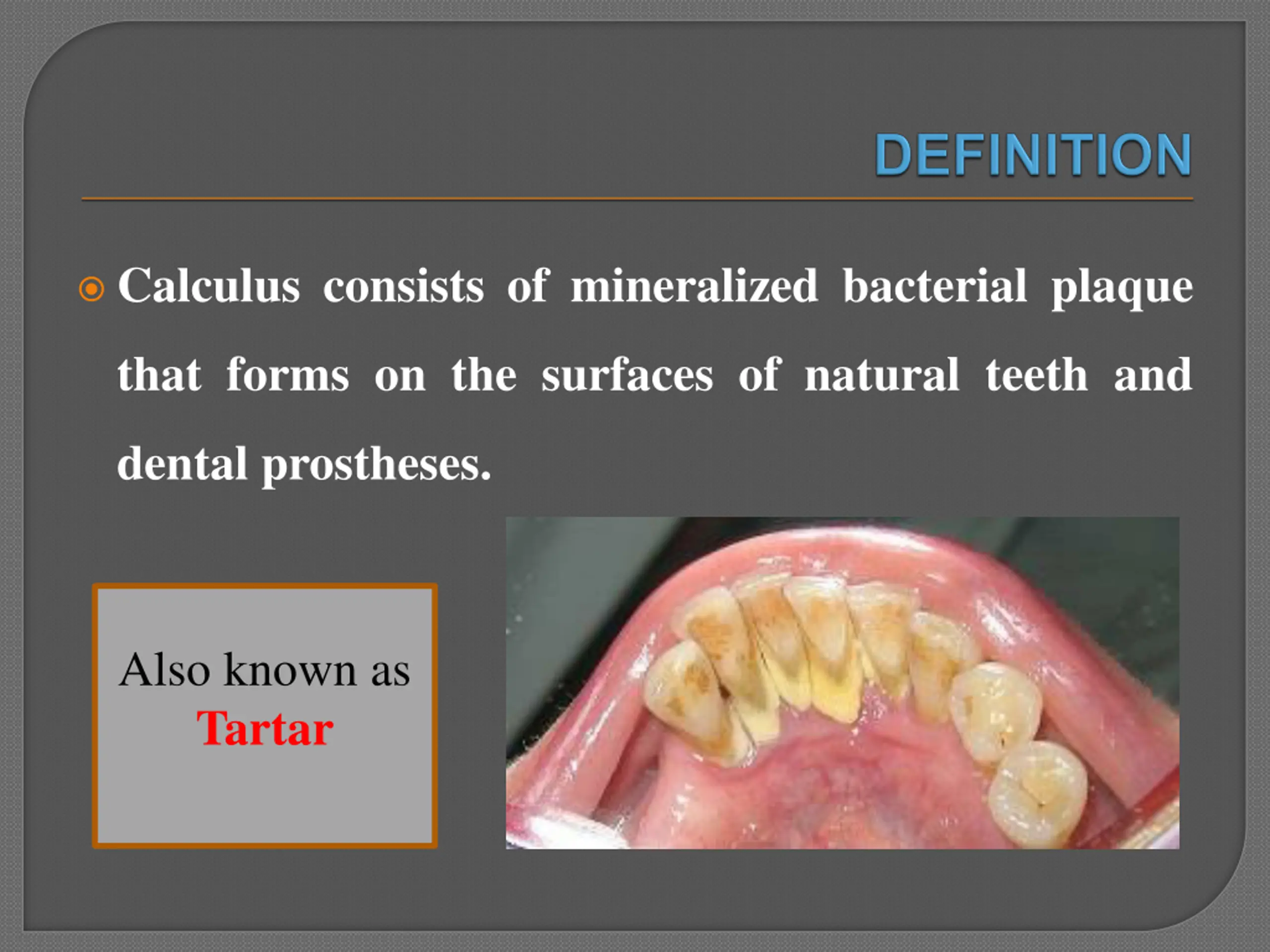 Calculus consists of mineralized bacterial plaque that forms on the surfaces of natural teeth and dental prostheses. Also known as Tartar