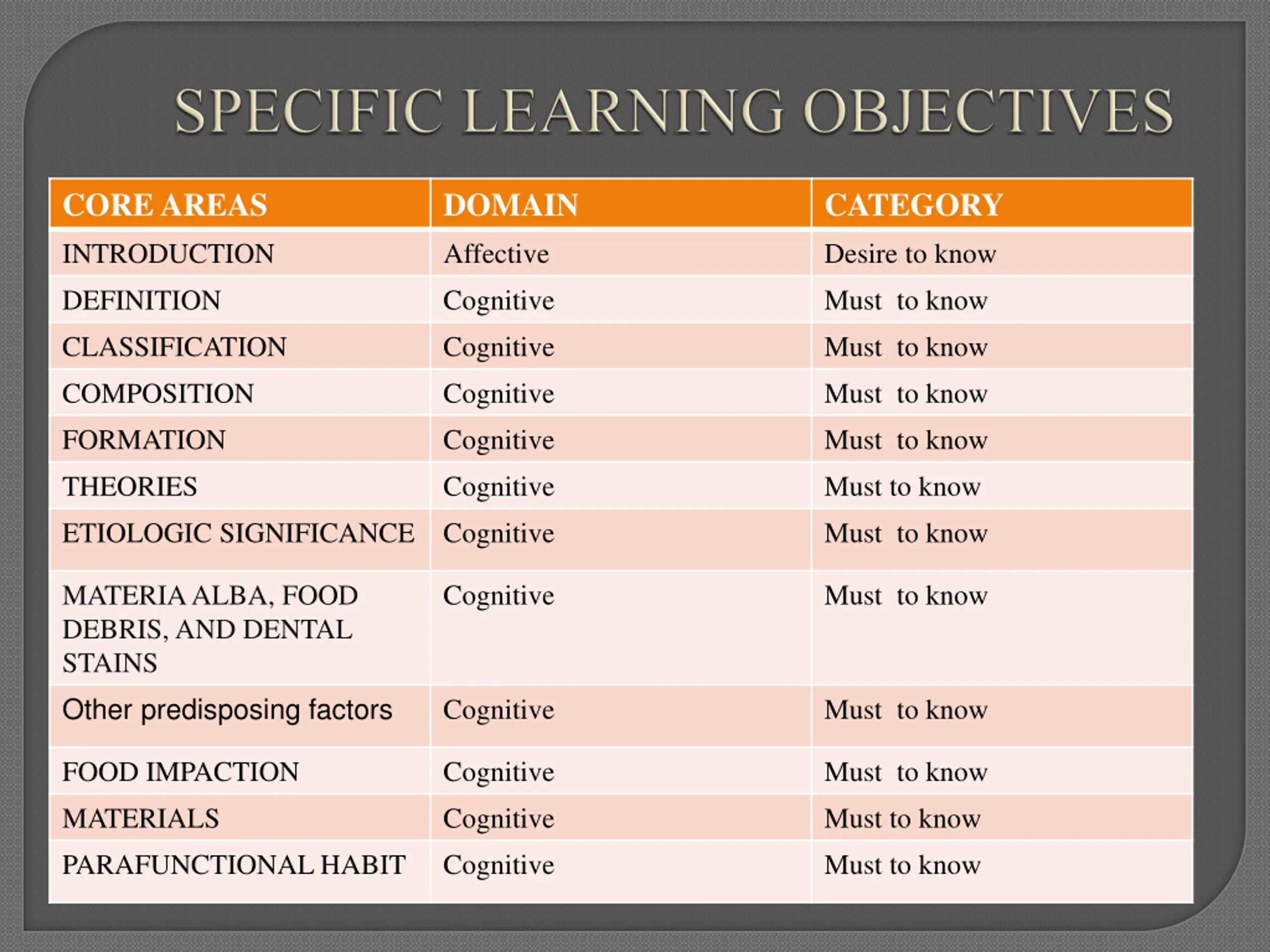 CORE AREAS DOMAIN CATEGORY INTRODUCTION Affective Desire to know DEFINITION Cognitive Must to know CLASSIFICATION Cognitive Must to know COMPOSITION Cognitive Must to know FORMATION Cognitive Must to know THEORIES Cognitive Must to know ETIOLOGIC SIGNIFICANCE Cognitive Must to know MATERIA ALBA, FOOD DEBRIS, AND DENTAL STAINS Other predisposing factors Cognitive Must to know Cognitive Must to know FOOD IMPACTION Cognitive Must to know MATERIALS Cognitive Must to know PARAFUNCTIONAL HABIT Cognitive Must to know