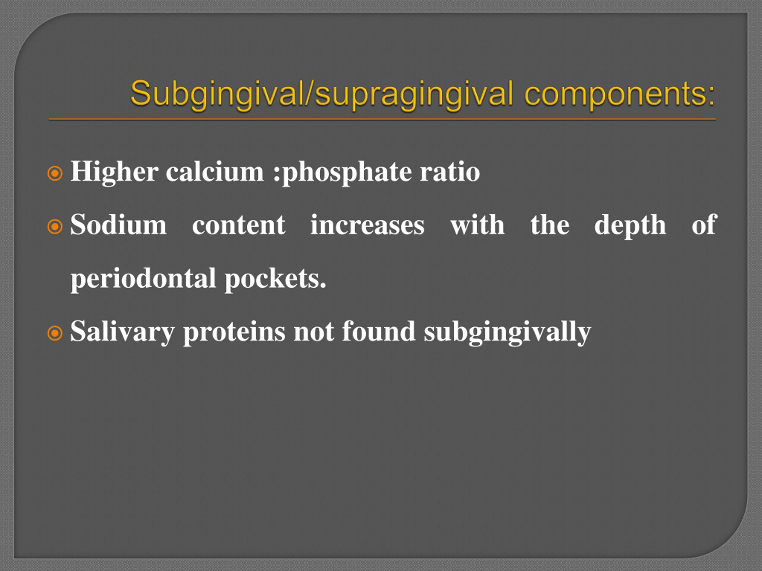 Higher calcium :phosphate ratio Sodium content increases with the depth of periodontal pockets. Salivary proteins not found subgingivally