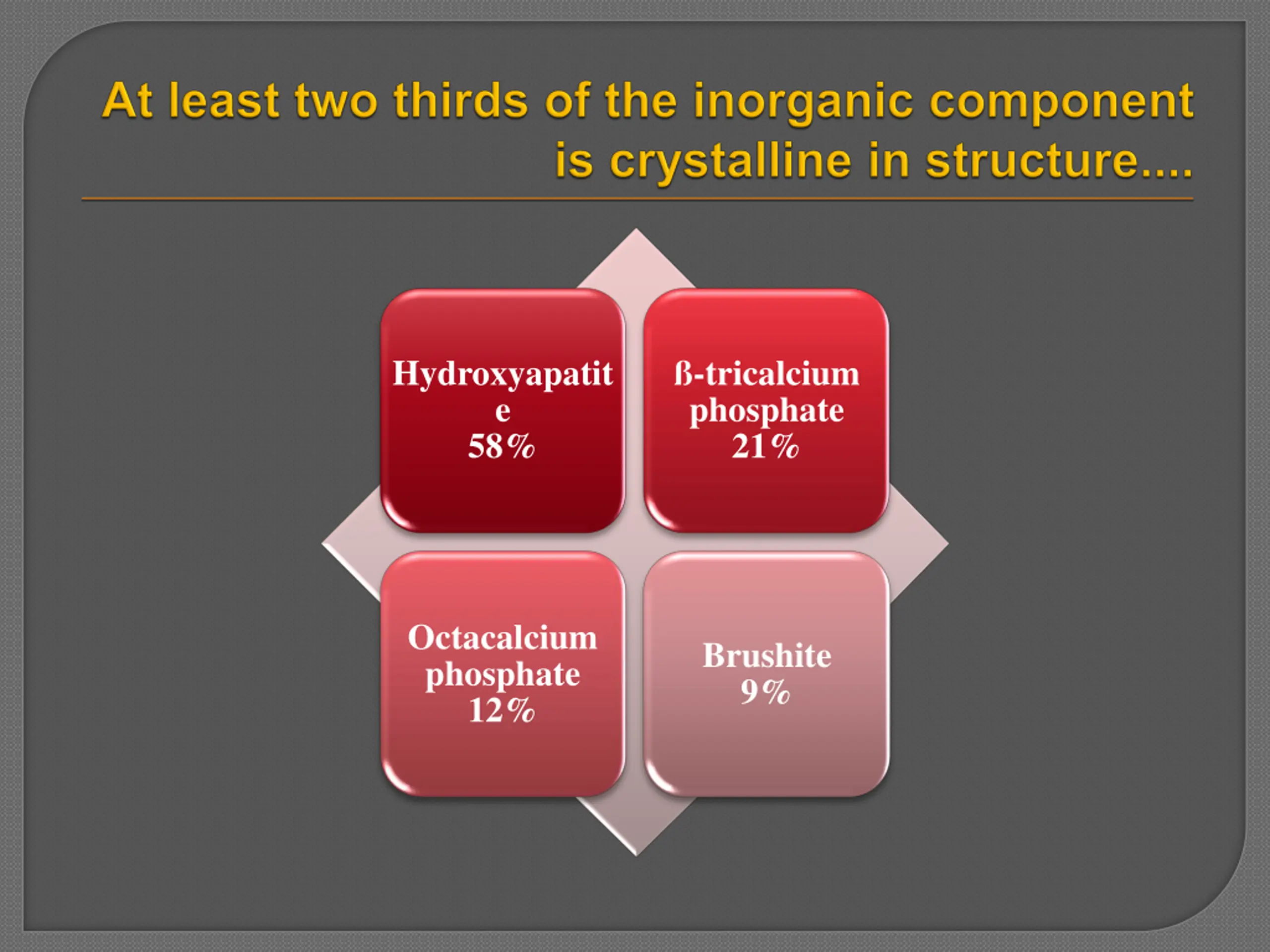 Hydroxyapatit e 58% -tricalcium phosphate 21% Octacalcium phosphate 12% Brushite 9%