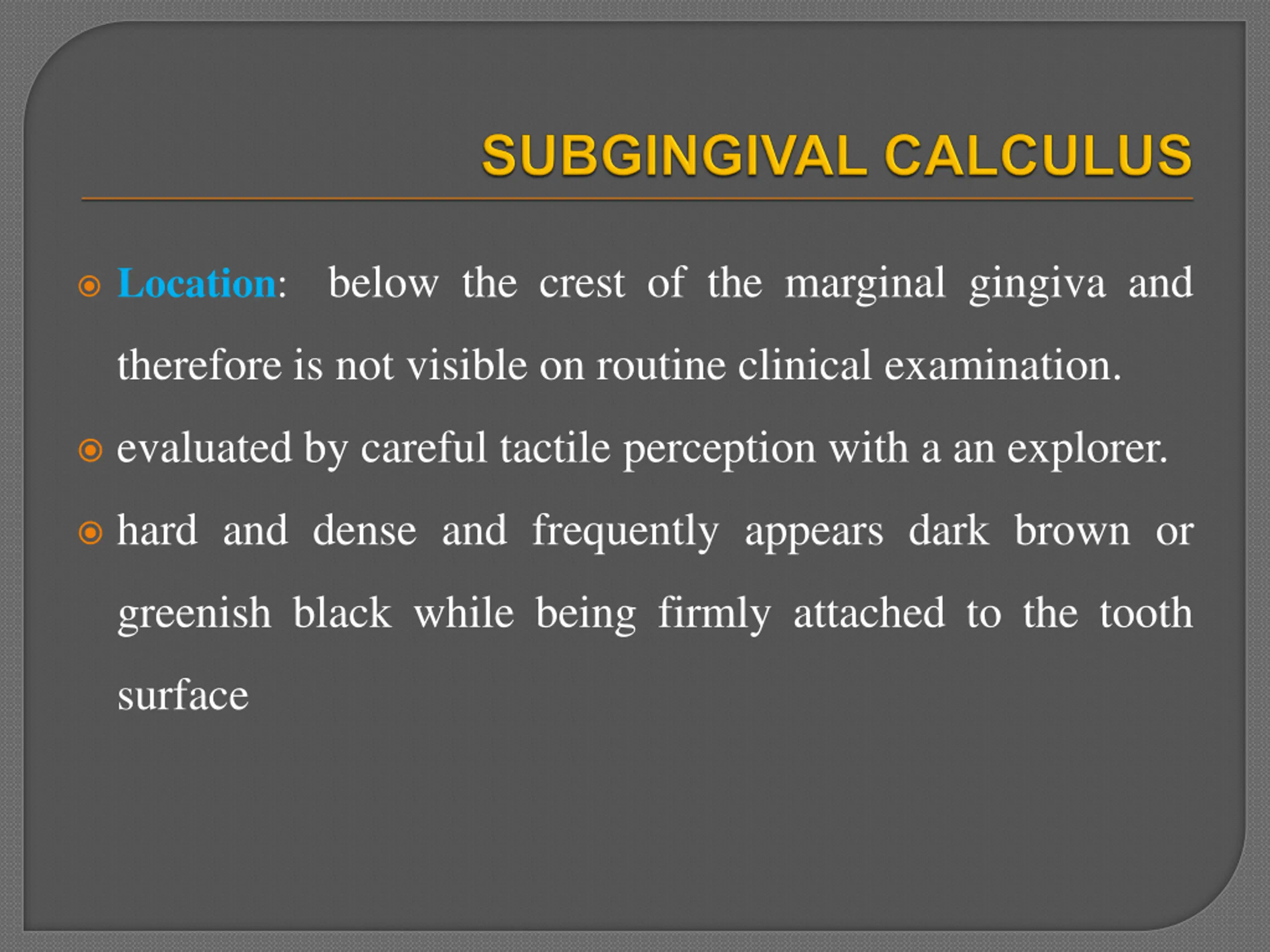Location: below the crest of the marginal gingiva and therefore is not visible on routine clinical examination. evaluated by careful tactile perception with a an explorer. hard and dense and frequently appears dark brown or greenish black while being firmly attached to the tooth surface