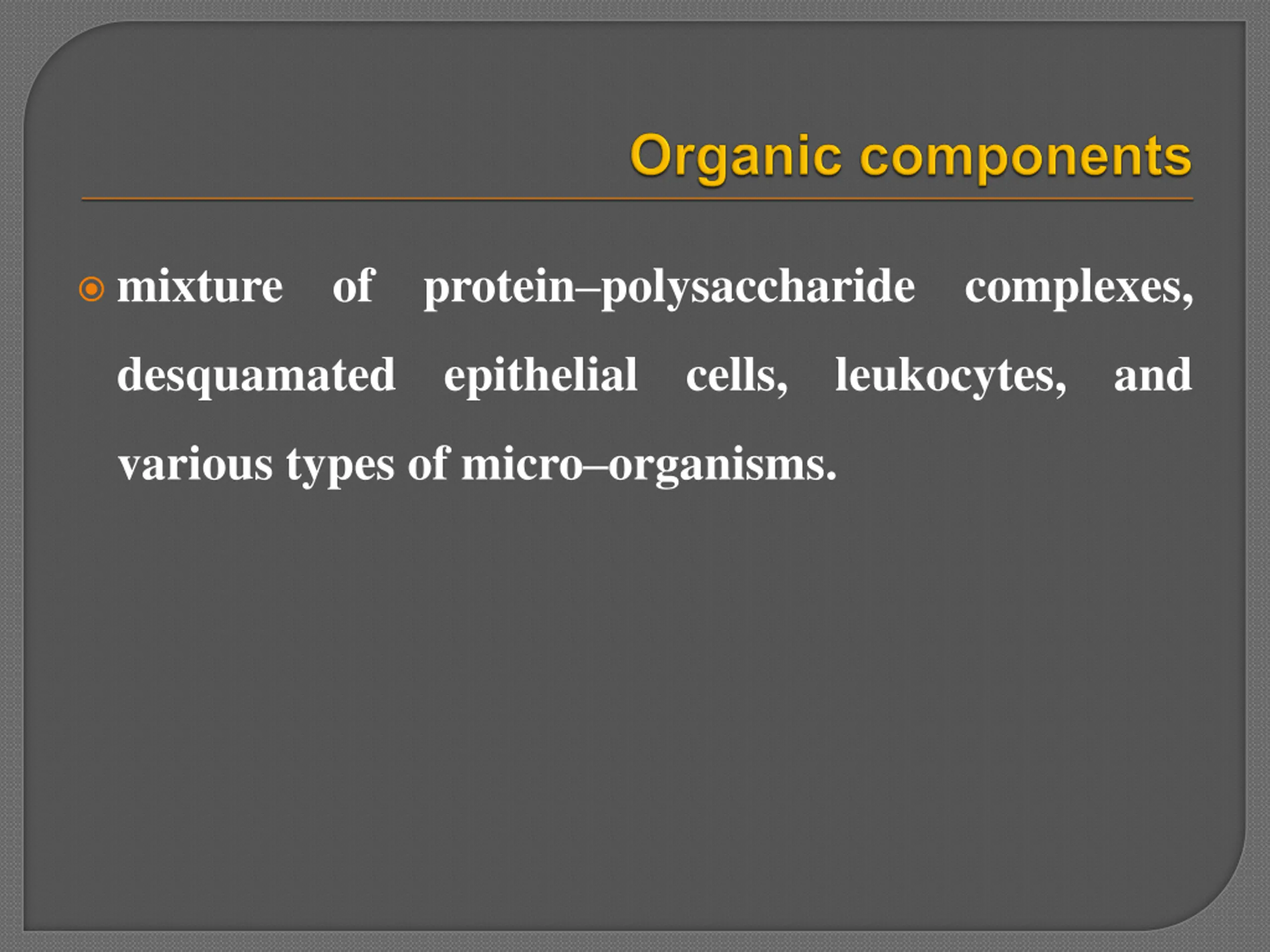 mixture of proteinpolysaccharide complexes, desquamated epithelial cells, leukocytes, and various types of micro organisms.