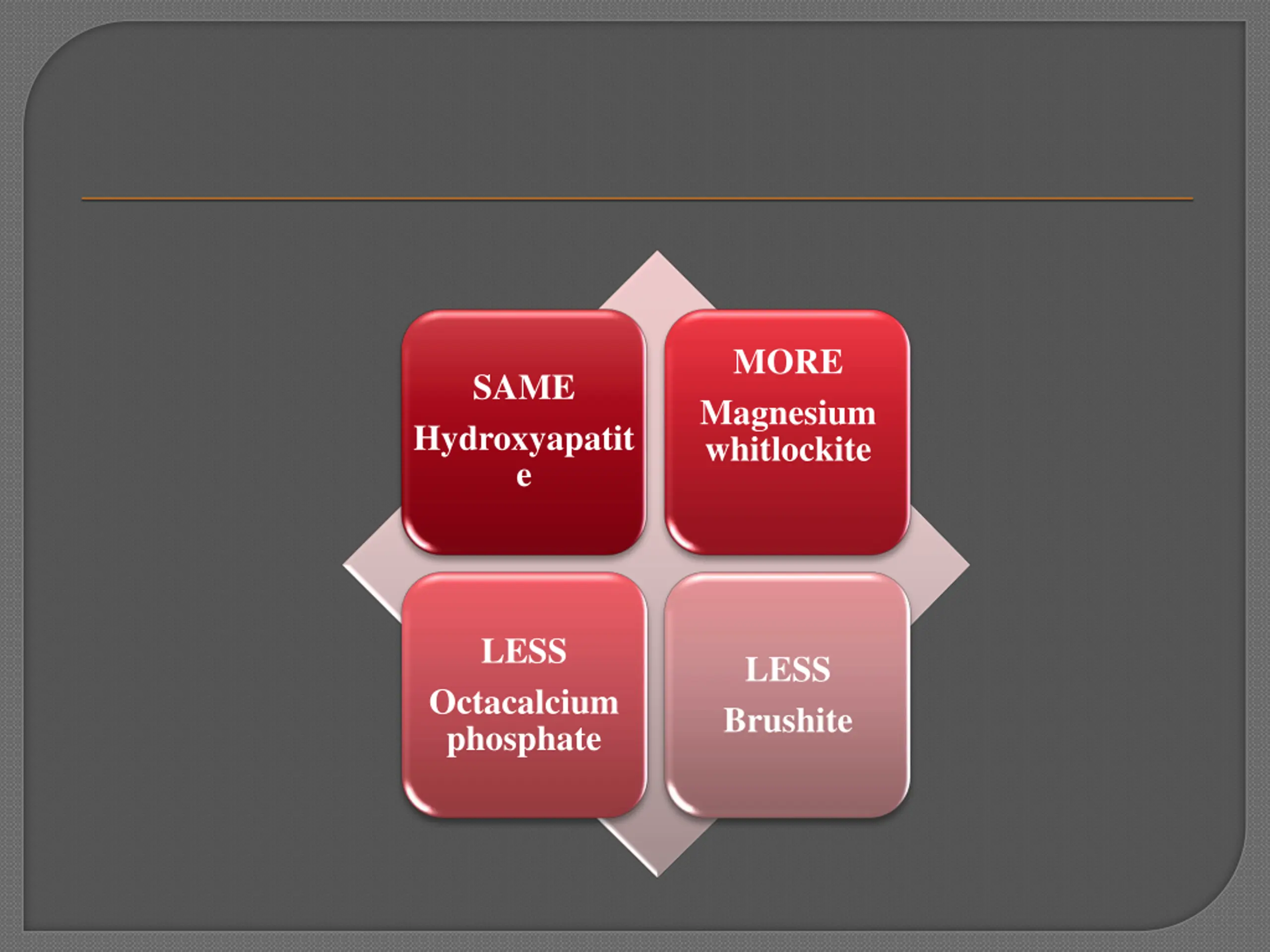 MORE Magnesium whitlockite SAME Hydroxyapatit e LESS LESS Brushite Octacalcium phosphate