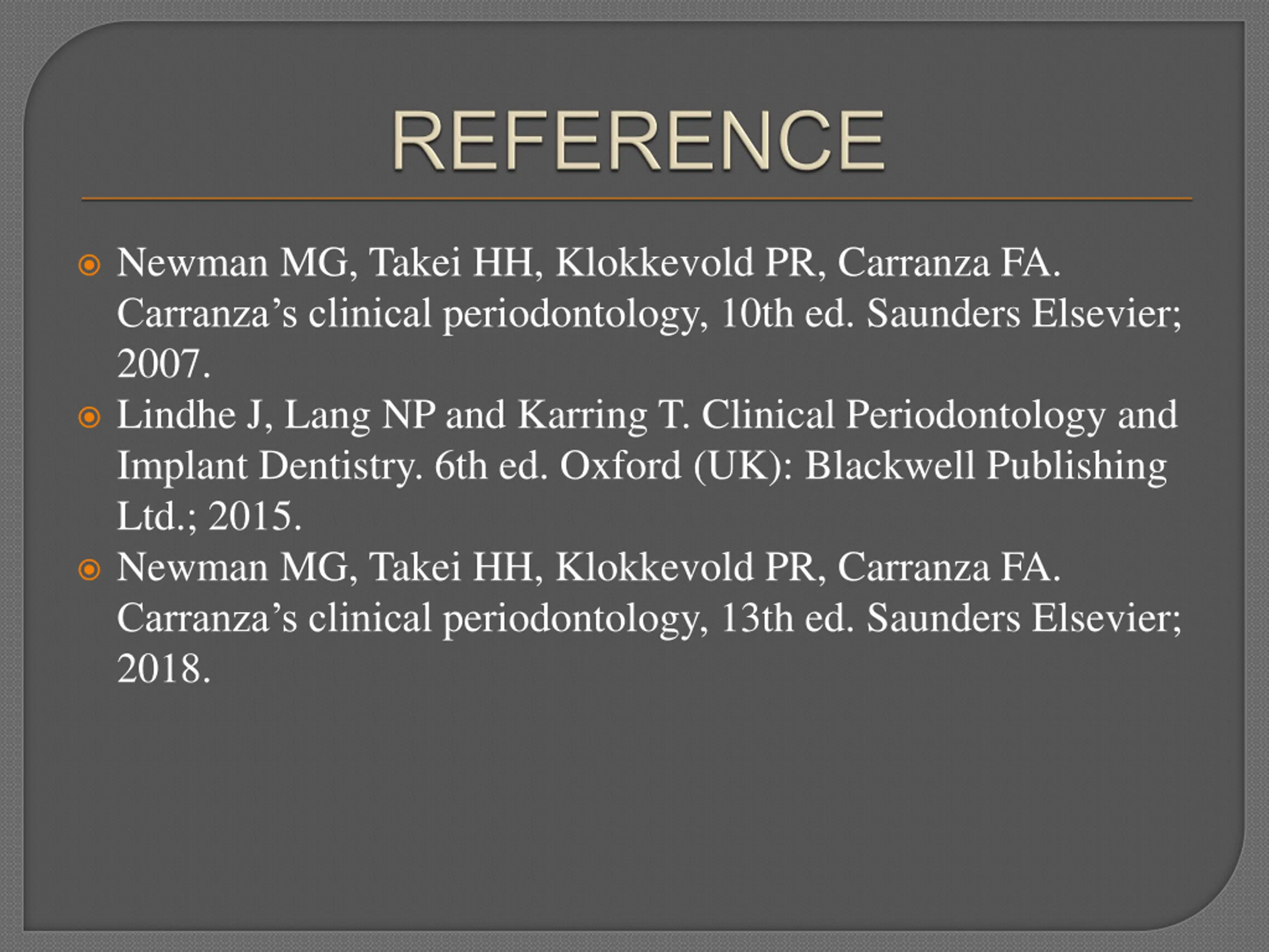 Newman MG, Takei HH, Klokkevold PR, Carranza FA. Carranza s clinical periodontology, 10th ed. Saunders Elsevier; 2007. Lindhe J, Lang NP and Karring T. Clinical Periodontology and Implant Dentistry. 6th ed. Oxford (UK): Blackwell Publishing Ltd.; 2015. Newman MG, Takei HH, Klokkevold PR, Carranza FA. Carranza s clinical periodontology, 13th ed. Saunders Elsevier; 2018.