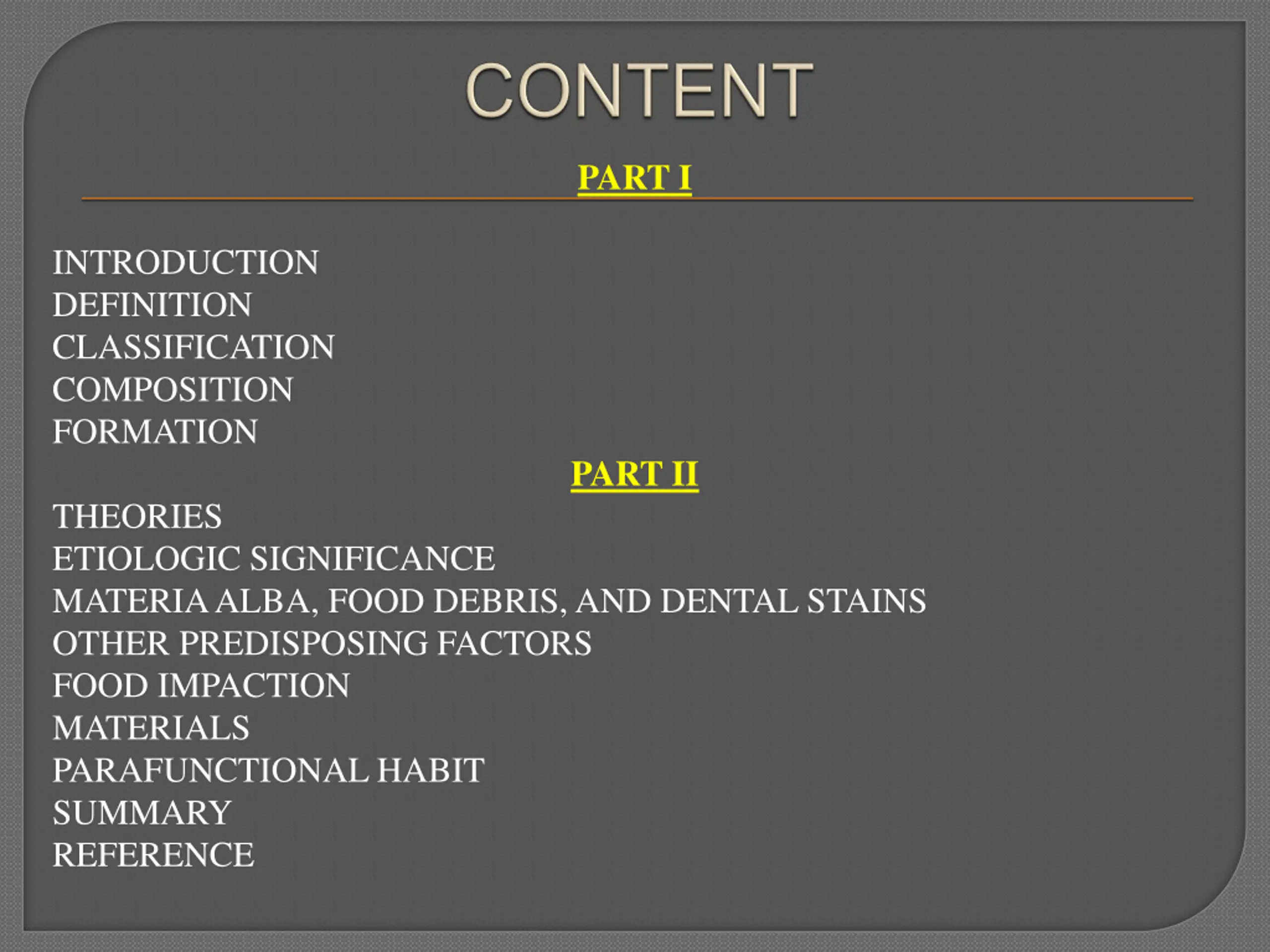 PART I INTRODUCTION DEFINITION CLASSIFICATION COMPOSITION FORMATION PART II THEORIES ETIOLOGIC SIGNIFICANCE MATERIA ALBA, FOOD DEBRIS, AND DENTAL STAINS OTHER PREDISPOSING FACTORS FOOD IMPACTION MATERIALS PARAFUNCTIONAL HABIT SUMMARY REFERENCE