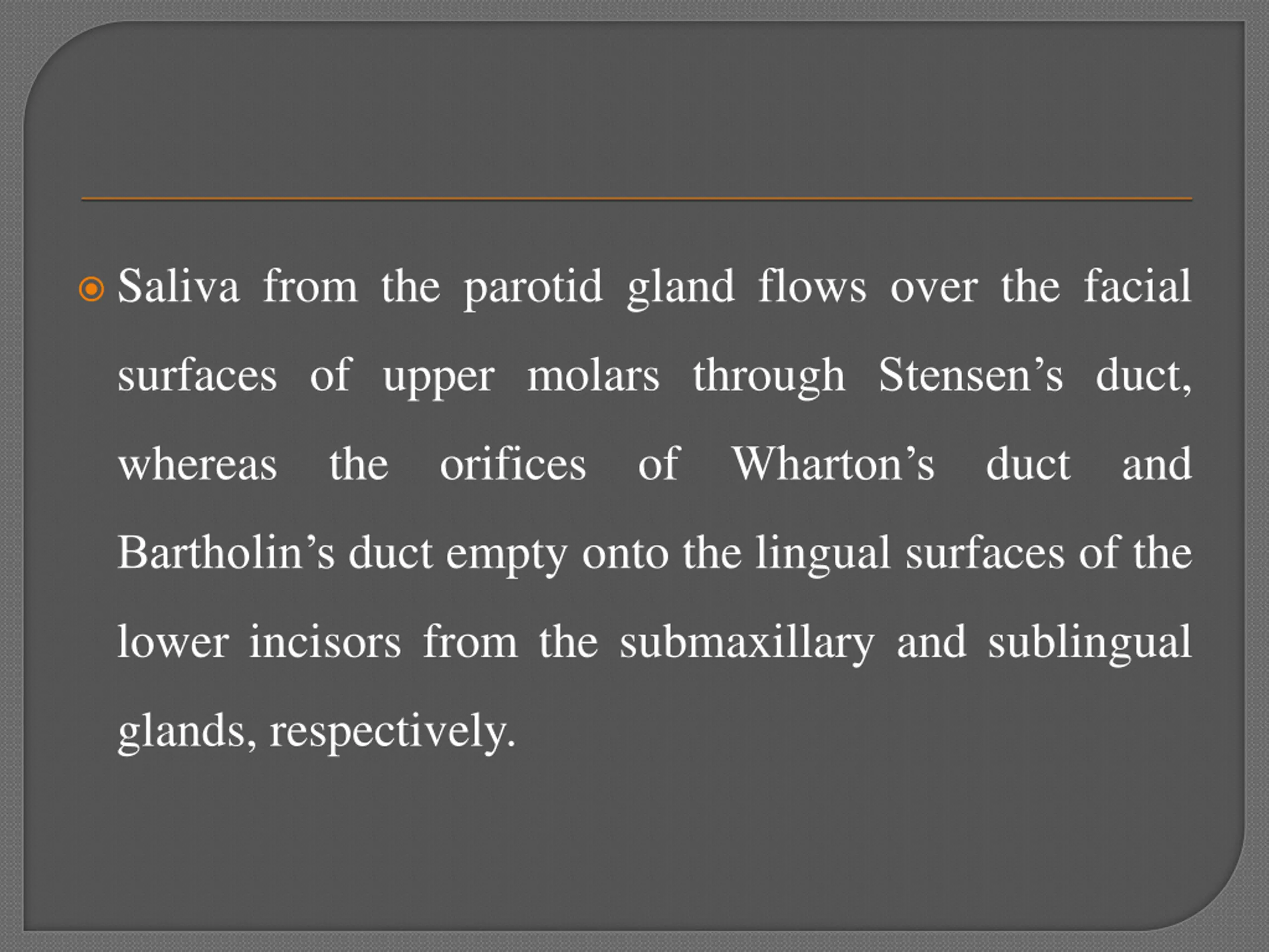 Saliva from the parotid gland flows over the facial surfaces of upper molars through Stensen s duct, whereas the orifices of Wharton s duct and Bartholin s duct empty onto the lingual surfaces of the lower incisors from the submaxillary and sublingual glands, respectively.