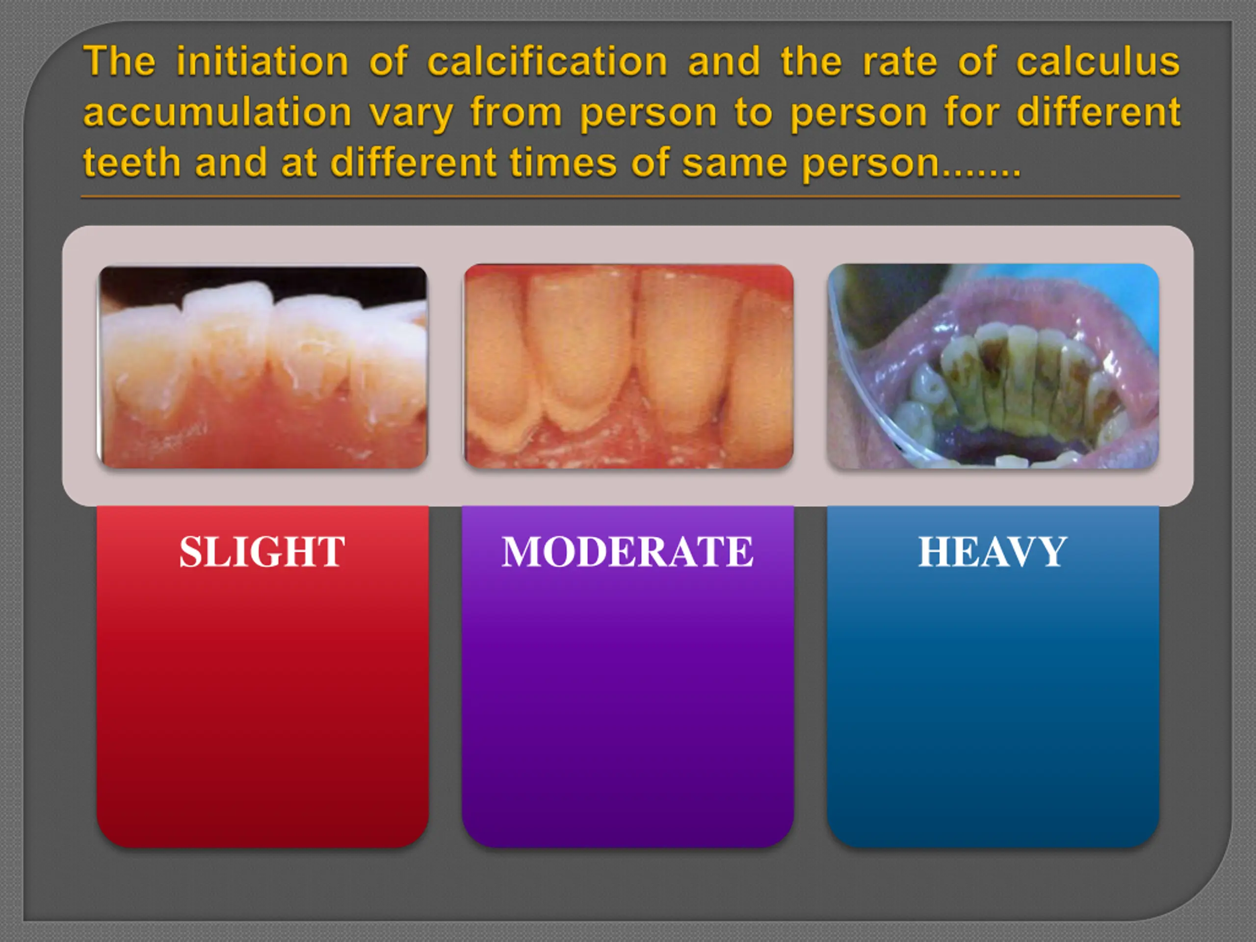 LOCATION: coronal to the gingival margin and therefore is visible in the oral cavity. COLOR: It is usually white or whitish yellow in color, CONSISTENCY: hard with claylike consistency, and easily detached from the tooth surface.