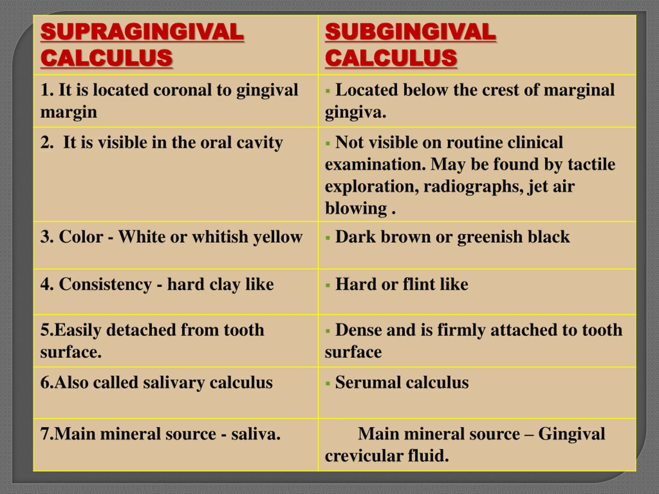 SUPRAGINGIVAL SUPRAGINGIVAL CALCULUS CALCULUS 1. It is located coronal to gingival margin 2. It is visible in the oral cavity SUBGINGIVAL SUBGINGIVAL CALCULUS CALCULUS Located below the crest of marginal gingiva. Not visible on routine clinical examination. May be found by tactile exploration, radiographs, jet air blowing . 3. Color - White or whitish yellow Dark brown or greenish black 4. Consistency - hard clay like Hard or flint like 5.Easily detached from tooth surface. 6.Also called salivary calculus Dense and is firmly attached to tooth surface Serumal calculus 7.Main mineral source - saliva. Main mineral source Gingival crevicular fluid.