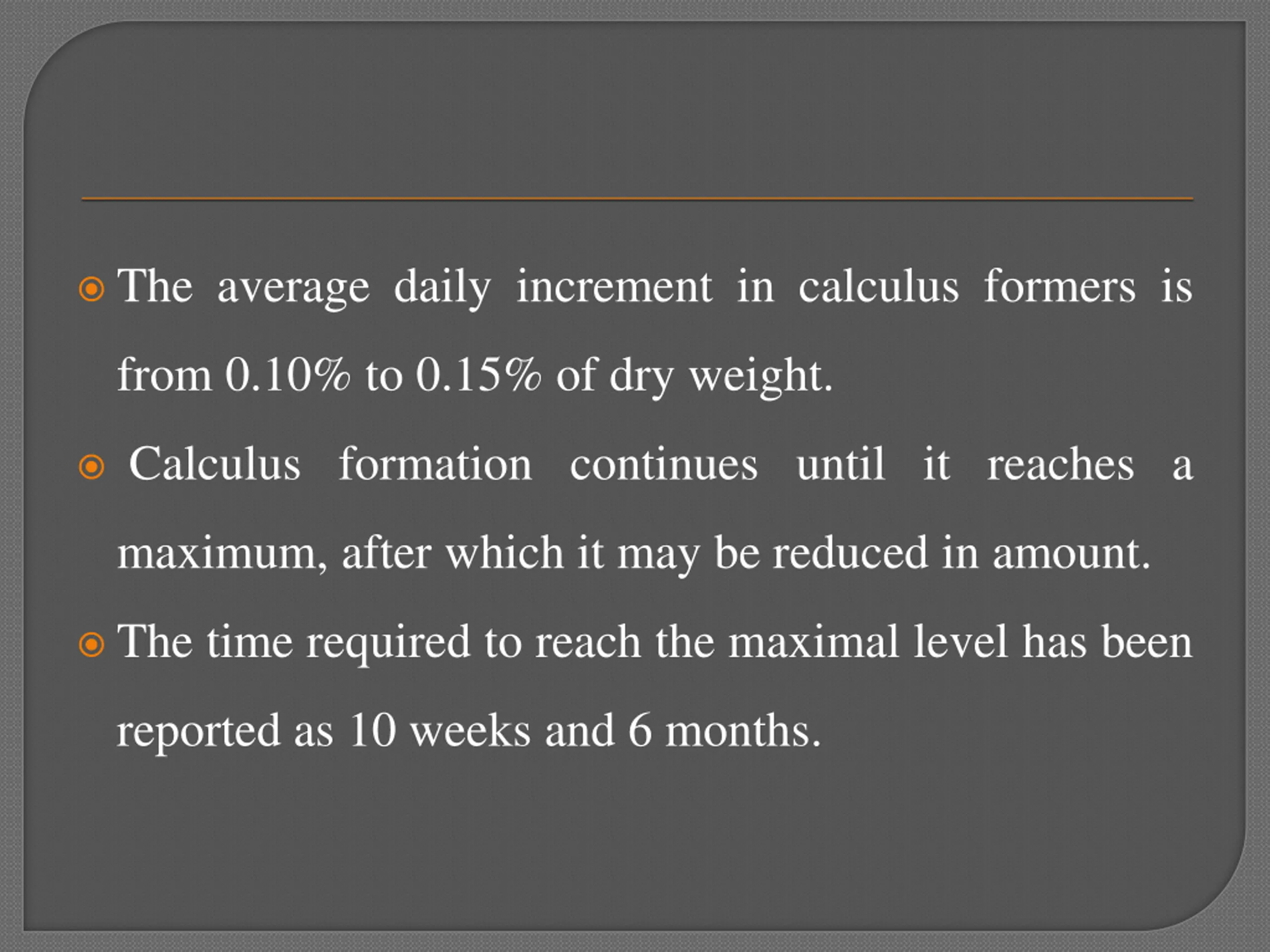 The average daily increment in calculus formers is from 0.10% to 0.15% of dry weight. Calculus formation continues until it reaches a maximum, after which it may be reduced in amount. The time required to reach the maximal level has been reported as 10 weeks and 6 months.