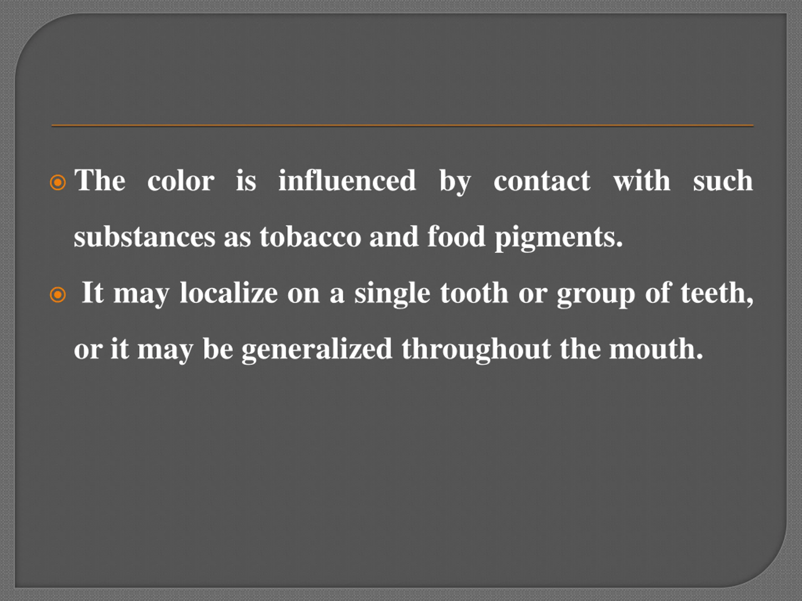 The color is influenced by contact with such substances as tobacco and food pigments. It may localize on a single tooth or group of teeth, or it may be generalized throughout the mouth.