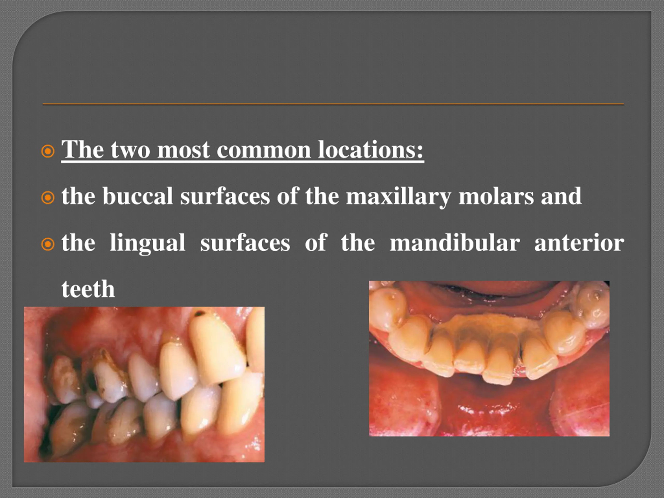 The two most common locations: the buccal surfaces of the maxillary molars and the lingual surfaces of the mandibular anterior teeth