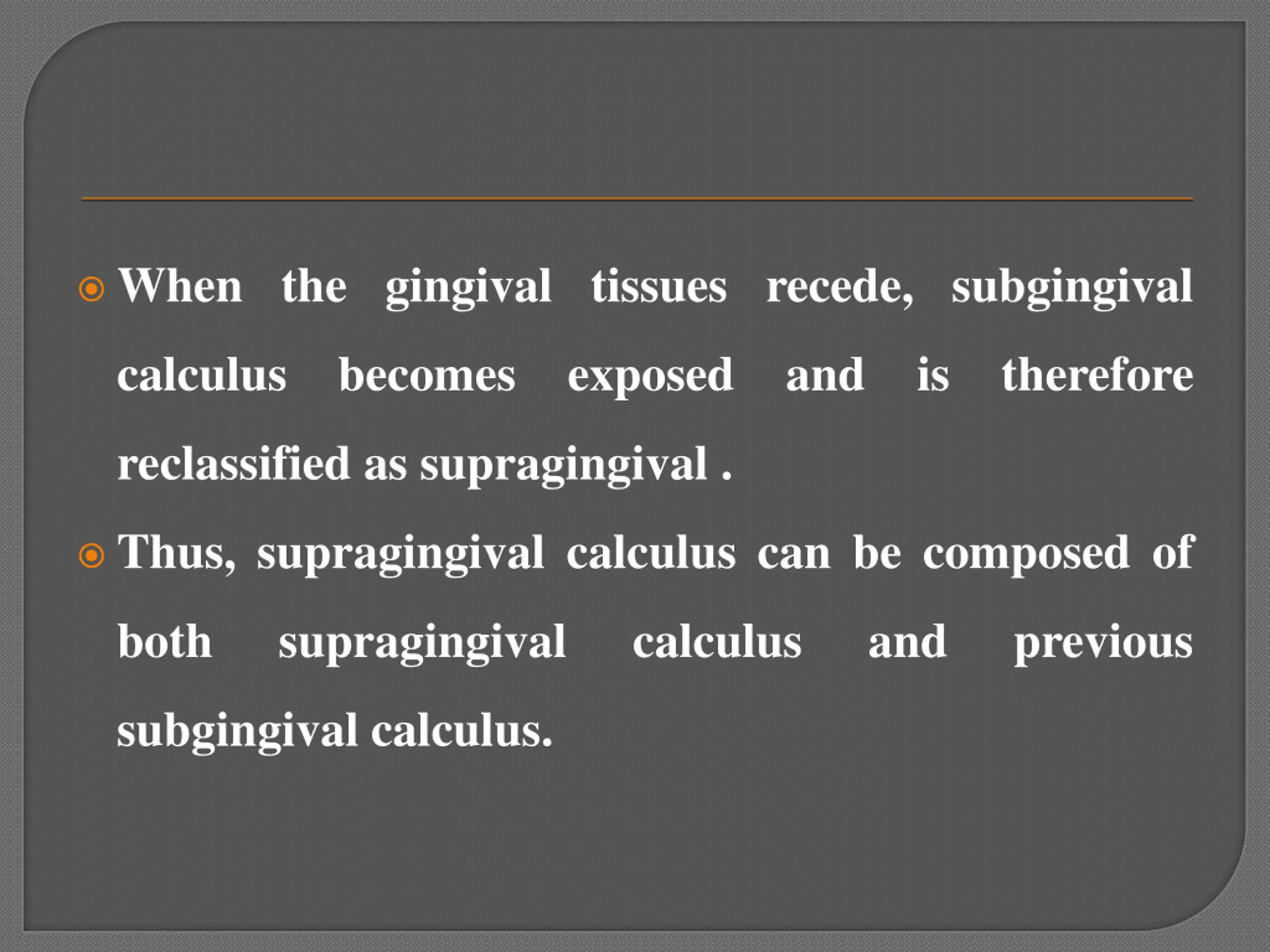When the gingival tissues recede, subgingival calculus becomes exposed and is therefore reclassified as supragingival . Thus, supragingival calculus can be composed of both supragingival calculus and previous subgingival calculus.