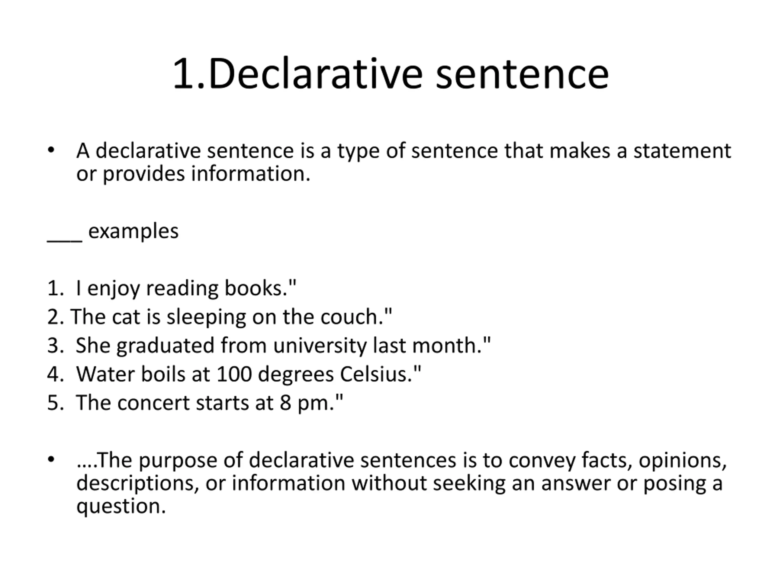 1.Declarative sentence A declarative sentence is a type of sentence that makes a statement or provides information. ___ examples 1. I enjoy reading books." 2. The cat is sleeping on the couch." 3. She graduated from university last month." 4. Water boils at 100 degrees Celsius." 5. The concert starts at 8 pm." .The purpose of declarative sentences is to convey facts, opinions, descriptions, or information without seeking an answer or posing a question.