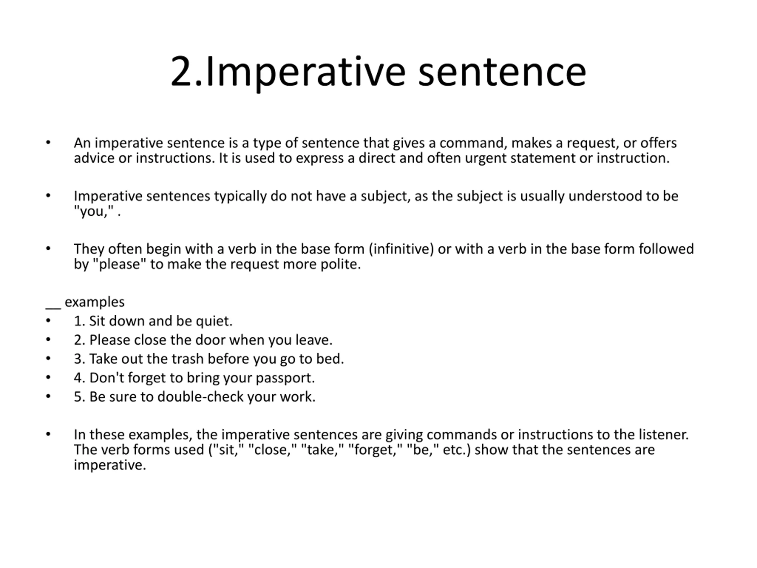 2.Imperative sentence An imperative sentence is a type of sentence that gives a command, makes a request, or offers advice or instructions. It is used to express a direct and often urgent statement or instruction. Imperative sentences typically do not have a subject, as the subject is usually understood to be "you," . They often begin with a verb in the base form (infinitive) or with a verb in the base form followed by "please" to make the request more polite. __ examples 1. Sit down and be quiet. 2. Please close the door when you leave. 3. Take out the trash before you go to bed. 4. Don't forget to bring your passport. 5. Be sure to double-check your work. In these examples, the imperative sentences are giving commands or instructions to the listener. The verb forms used ("sit," "close," "take," "forget," "be," etc.) show that the sentences are imperative.