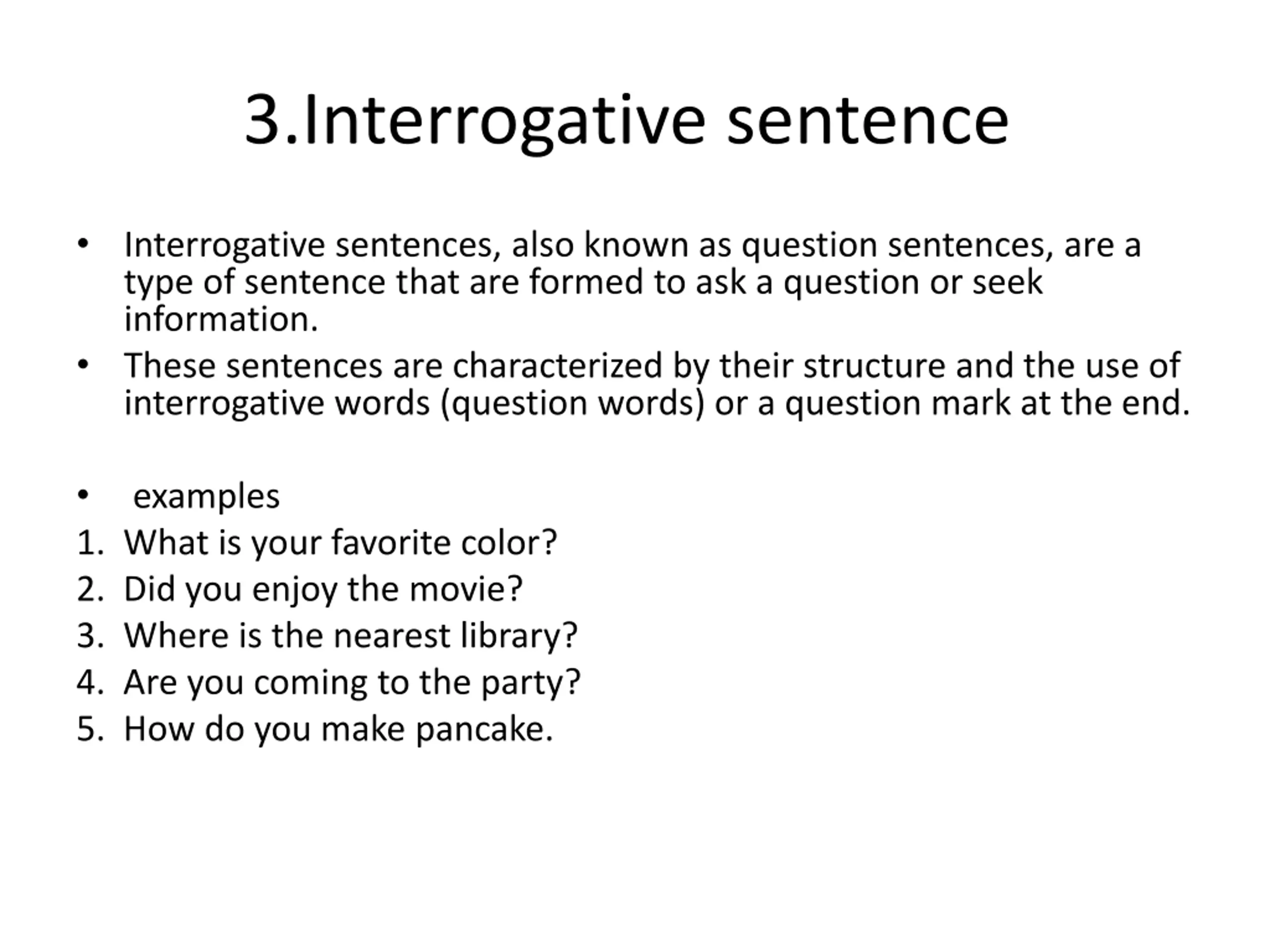 3.Interrogative sentence Interrogative sentences, also known as question sentences, are a type of sentence that are formed to ask a question or seek information. These sentences are characterized by their structure and the use of interrogative words (question words) or a question mark at the end. 1. What is your favorite color? 2. Did you enjoy the movie? 3. Where is the nearest library? 4. Are you coming to the party? 5. How do you make pancake. examples