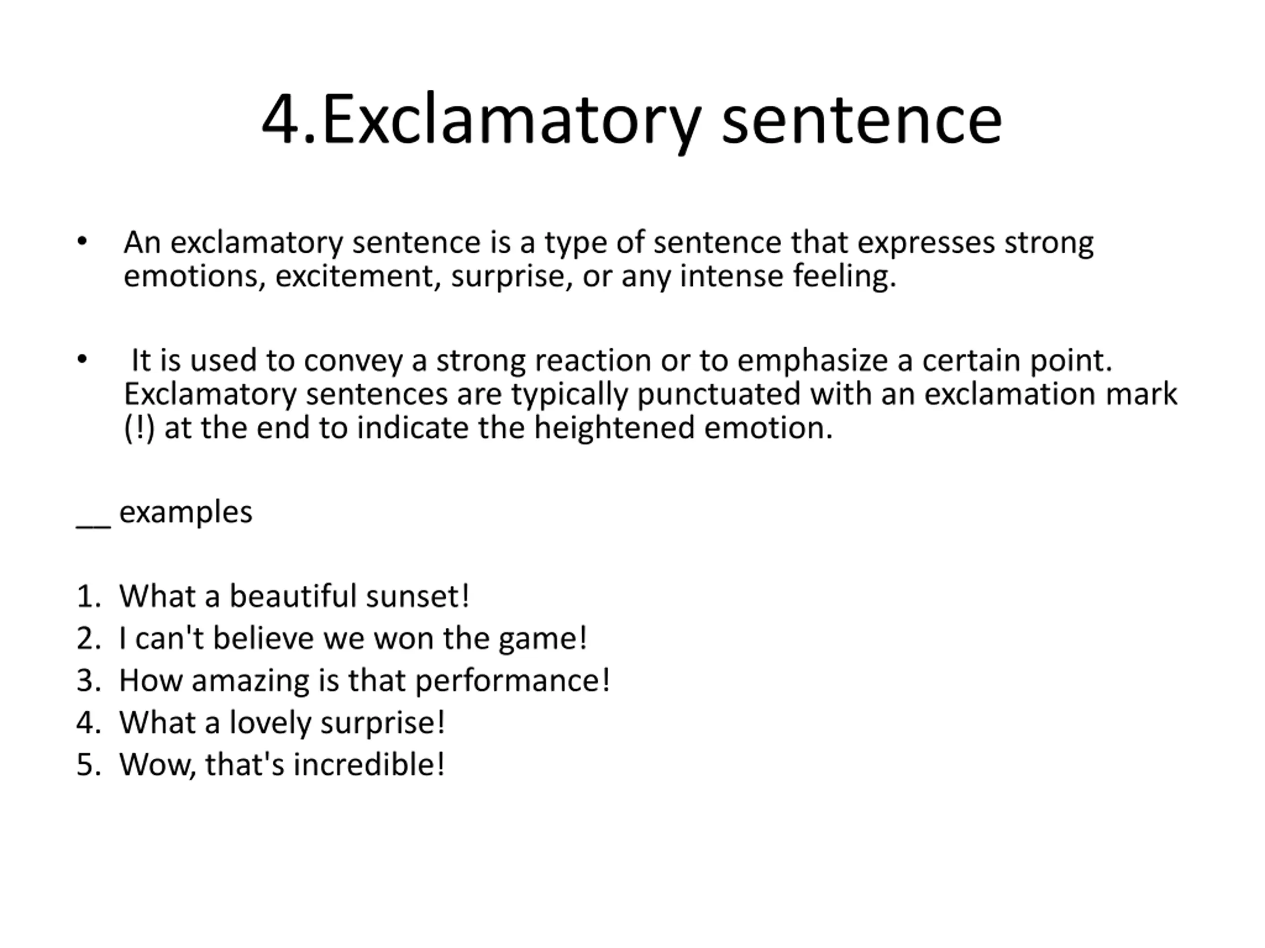 4.Exclamatory sentence An exclamatory sentence is a type of sentence that expresses strong emotions, excitement, surprise, or any intense feeling. It is used to convey a strong reaction or to emphasize a certain point. Exclamatory sentences are typically punctuated with an exclamation mark (!) at the end to indicate the heightened emotion. __ examples 1. What a beautiful sunset! 2. I can't believe we won the game! 3. How amazing is that performance! 4. What a lovely surprise! 5. Wow, that's incredible!