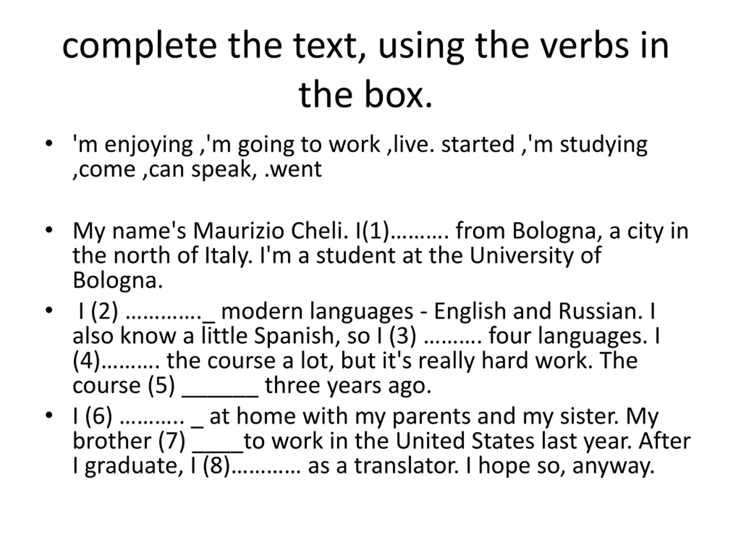 complete the text, using the verbs in the box. 'm enjoying ,'m going to work ,live. started ,'m studying ,come ,can speak, .went My name's Maurizio Cheli. I(1) . from Bologna, a city in the north of Italy. I'm a student at the University of Bologna. I (2) ._ modern languages - English and Russian. I also know a little Spanish, so I (3) . four languages. I (4) . the course a lot, but it's really hard work. The course (5) ______ three years ago. I (6) .. _ at home with my parents and my sister. My brother (7) ____to work in the United States last year. After I graduate, I (8) as a translator. I hope so, anyway.