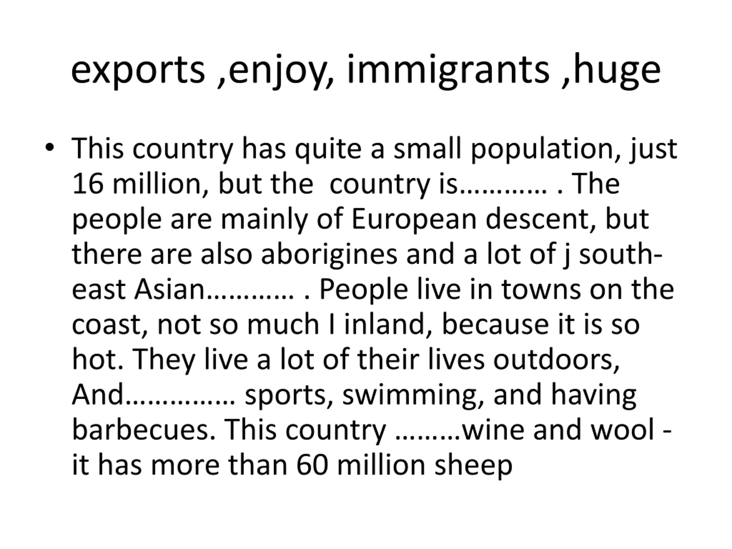 exports ,enjoy, immigrants ,huge This country has quite a small population, just 16 million, but the country is . The people are mainly of European descent, but there are also aborigines and a lot of j south- east Asian . People live in towns on the coast, not so much I inland, because it is so hot. They live a lot of their lives outdoors, And sports, swimming, and having barbecues. This country wine and wool - it has more than 60 million sheep