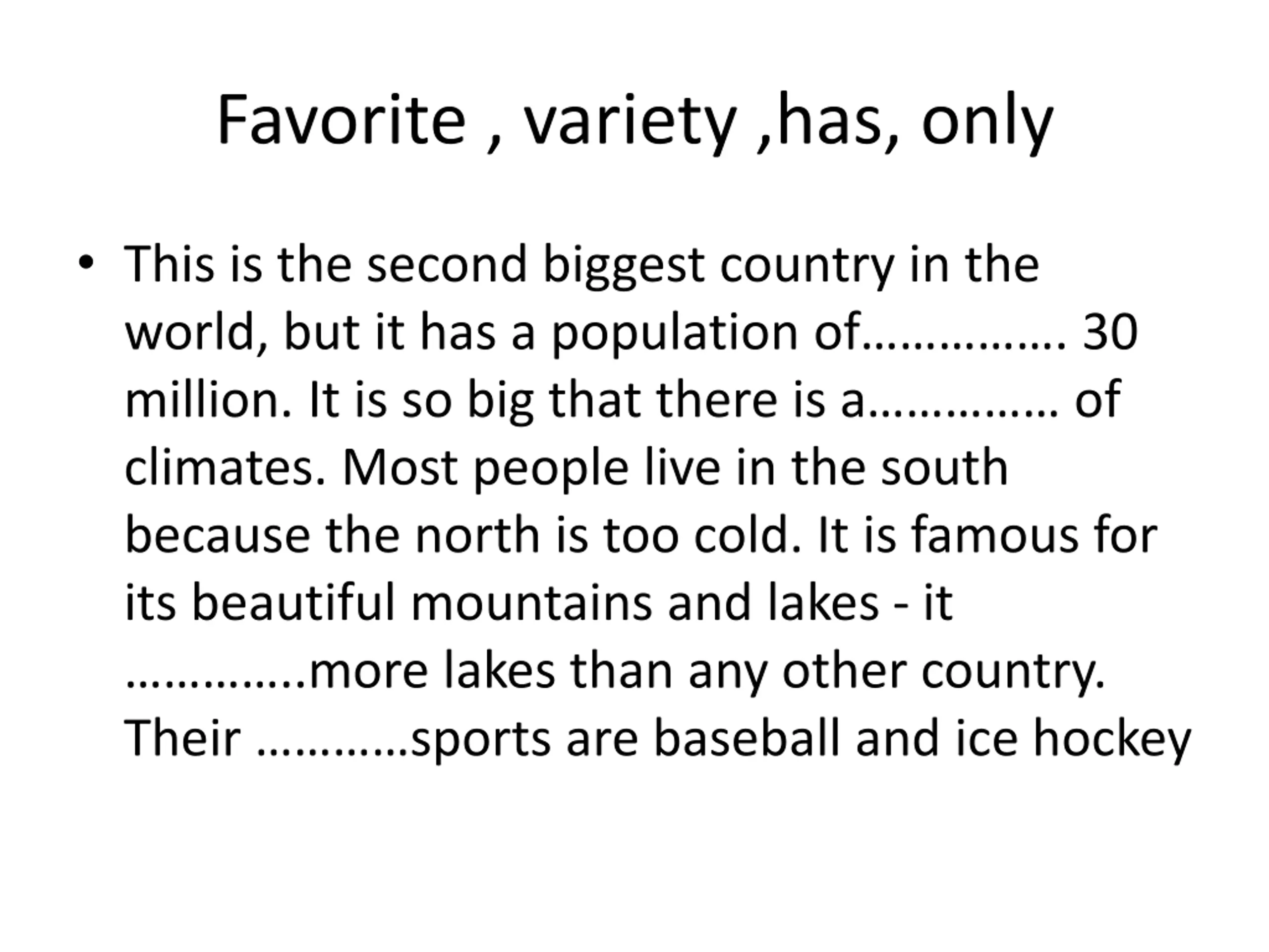 Favorite , variety ,has, only This is the second biggest country in the world, but it has a population of . 30 million. It is so big that there is a of climates. Most people live in the south because the north is too cold. It is famous for its beautiful mountains and lakes - it ..more lakes than any other country. Their sports are baseball and ice hockey