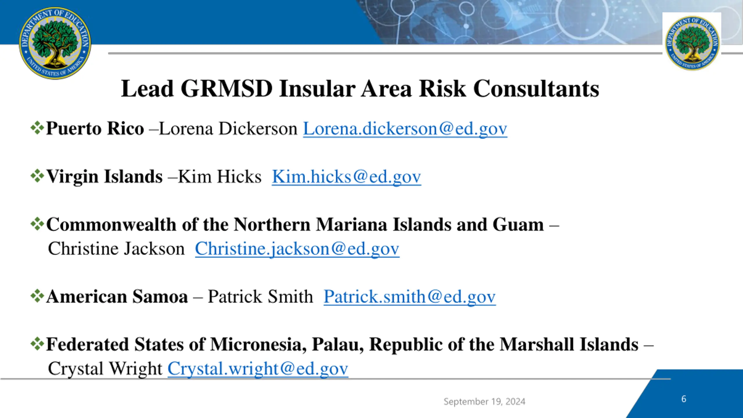 Lead GRMSD Insular Area Risk Consultants Puerto Rico Lorena Dickerson Lorena.dickerson@ed.gov Virgin Islands Kim Hicks Kim.hicks@ed.gov Commonwealth of the Northern Mariana Islands and Guam Christine Jackson Christine.jackson@ed.gov American Samoa Patrick Smith Patrick.smith@ed.gov Federated States of Micronesia, Palau, Republic of the Marshall Islands Crystal Wright Crystal.wright@ed.gov 6 September 19, 2024
