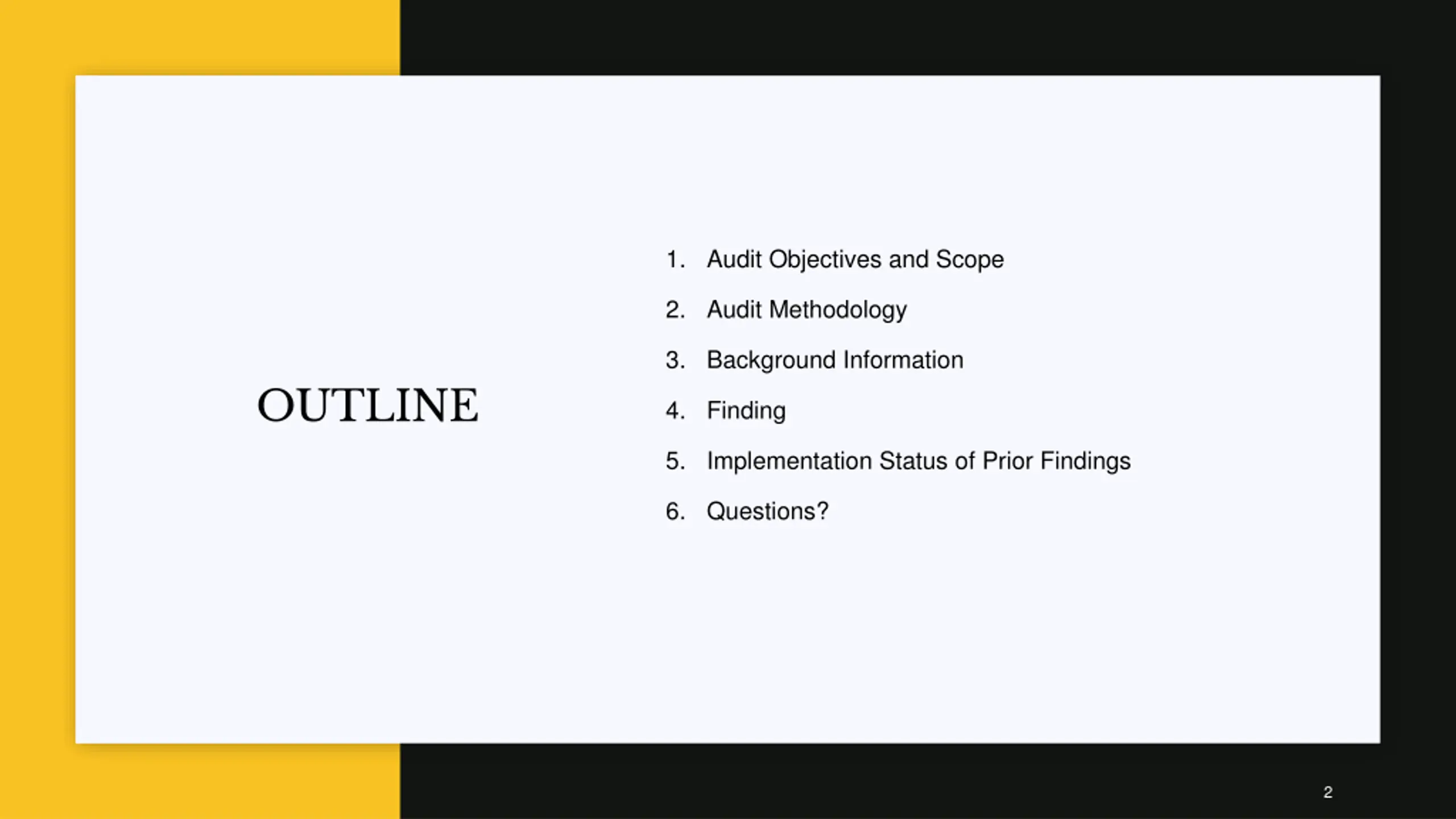 1. Audit Objectives and Scope 2. Audit Methodology 3. Background Information OUTLINE 4. Finding 5. Implementation Status of Prior Findings 6. Questions? 2