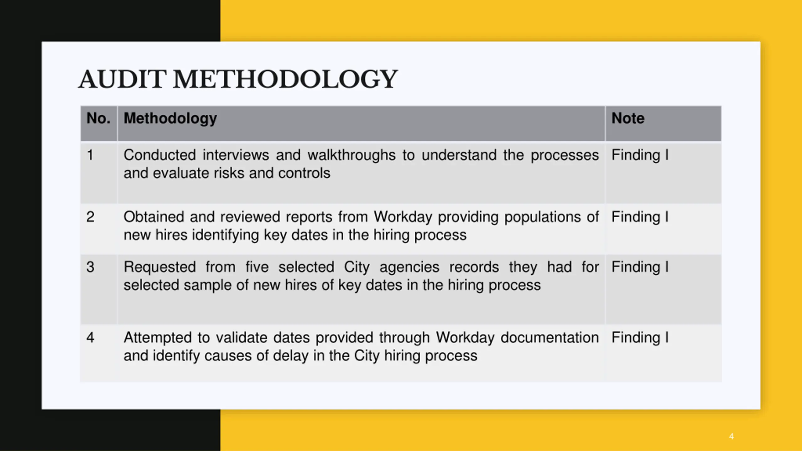 AUDIT METHODOLOGY No. Methodology Note 1 Conducted interviews and walkthroughs to understand the processes and evaluate risks and controls Finding I 2 Obtained and reviewed reports from Workday providing populations of new hires identifying key dates in the hiring process Finding I 3 Requested from five selected City agencies records they had for selected sample of new hires of key dates in the hiring process Finding I 4 Attempted to validate dates provided through Workday documentation and identify causes of delay in the City hiring process Finding I 4